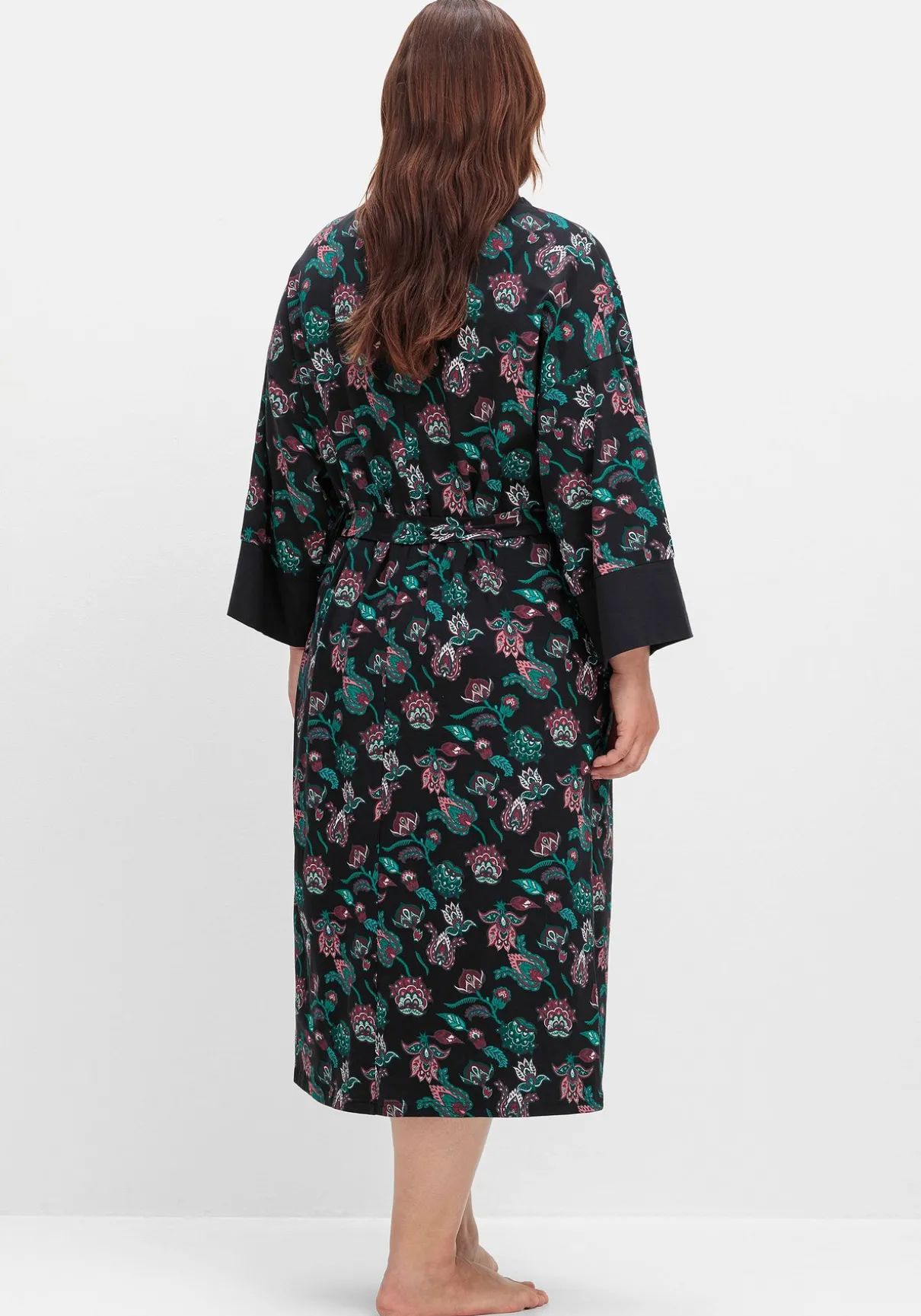 Morgenmantel mit V-Ausschnitt und 3/4-Ärmeln. Der bequeme Wohlfühl-Style präsentiert sich mit einem abnehmbaren Bindegürtel und zwei seitlichen Taschen.