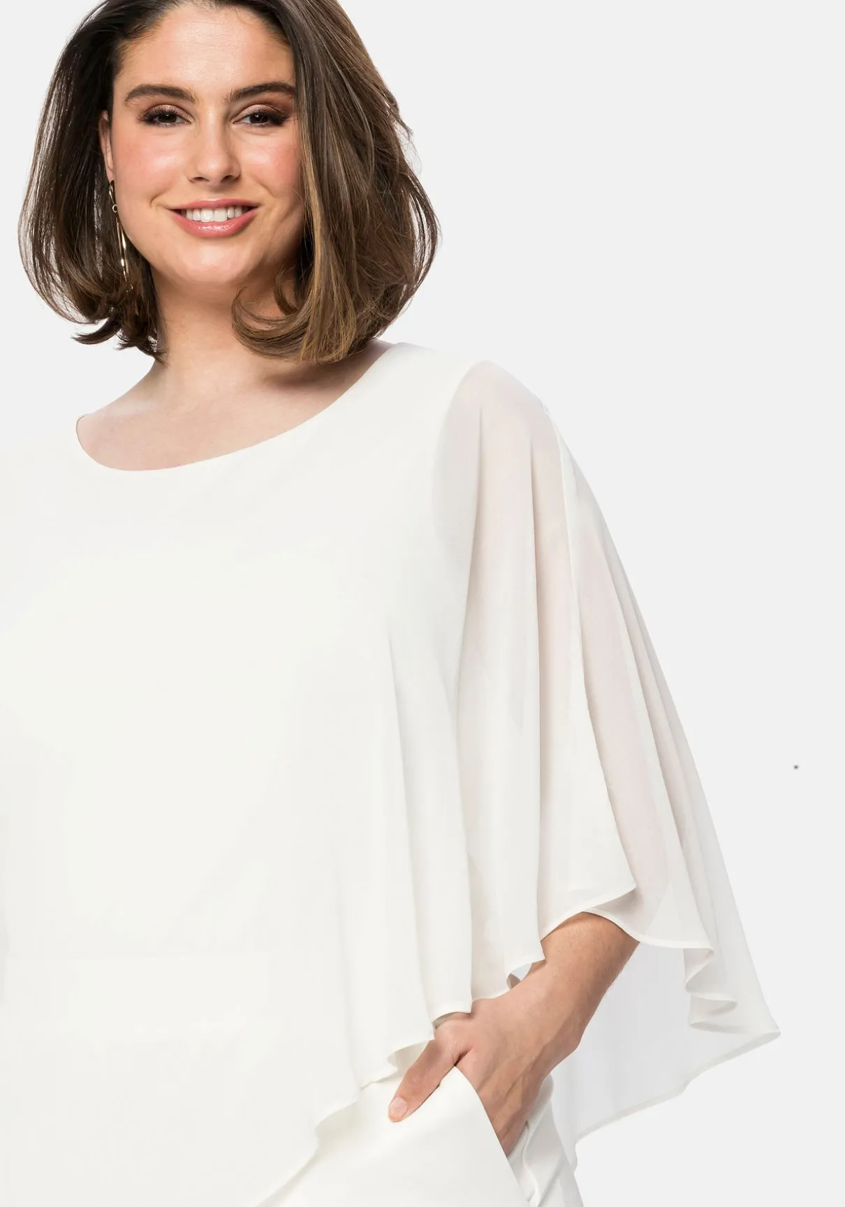 Das leicht transparente Cape besteht aus fließendem Chiffon, der Overall ist aus elastischem Viskosejersey gearbeitet. Die edle Qualität überzeugt mit feinem Schimmer und ist angenehm blickdicht.