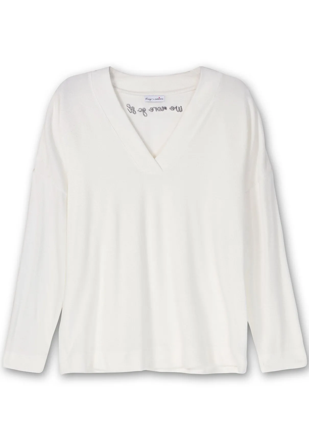 Sweatshirt aus softer, elastischer Feinstrick-Qualität, von sheego by Joe Browns. Der feminine V-Ausschnitt ist leicht überlappend gestaltet, überschnittene Schultern sorgen für eine lässige Optik. Eine dekorative Schriftzug-Stickerei im Rücken verleiht dem cleanen Look einen farblichen Akzent. Kombiniere das Oberteil mit einer Relaxhose aus unserer Homewear Kollektion – und schon ist dein Wohlfühl-Look komplett.