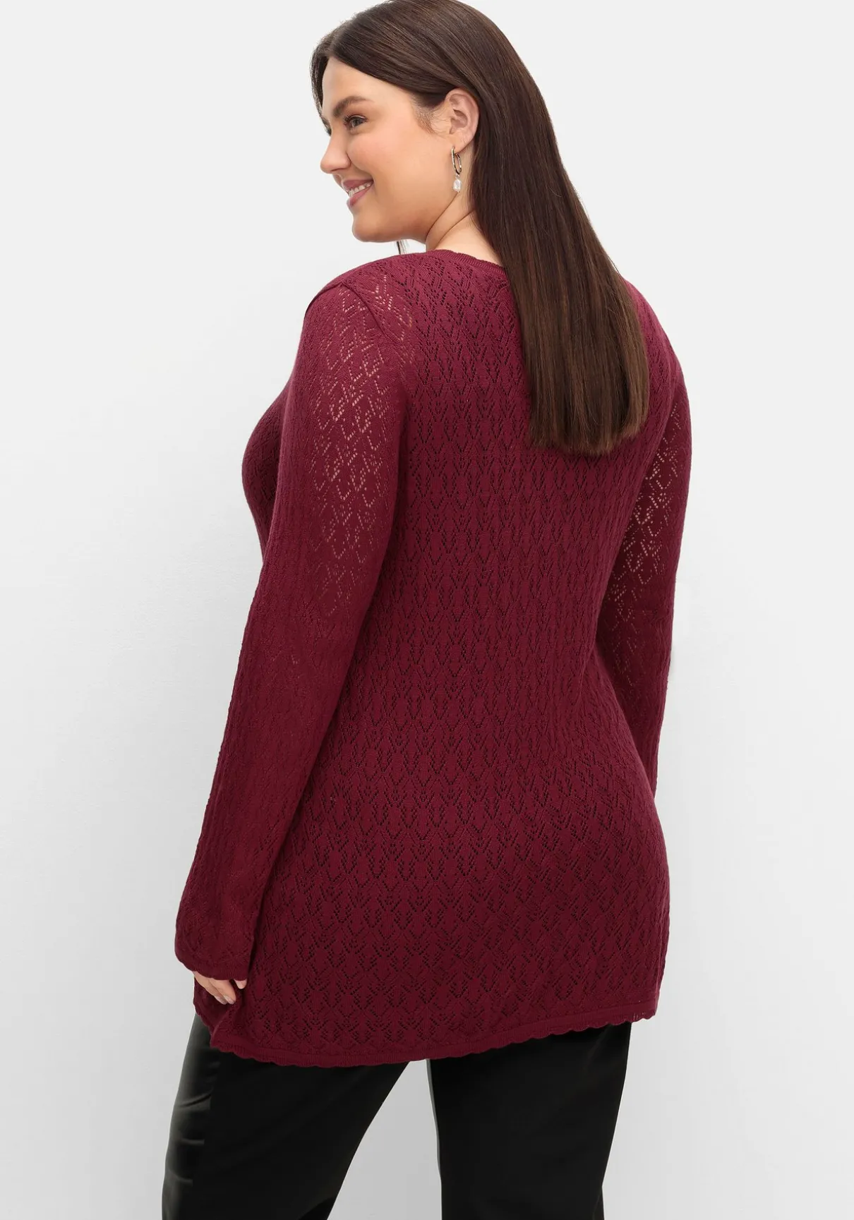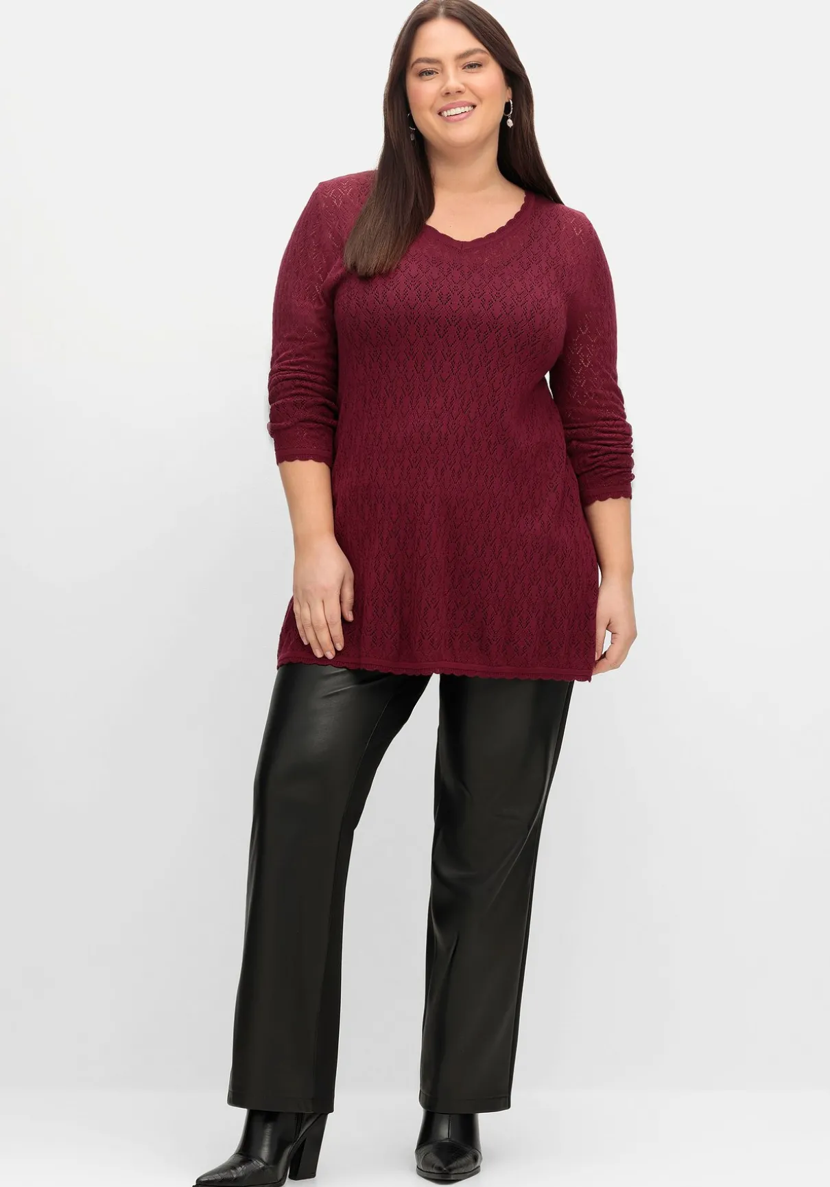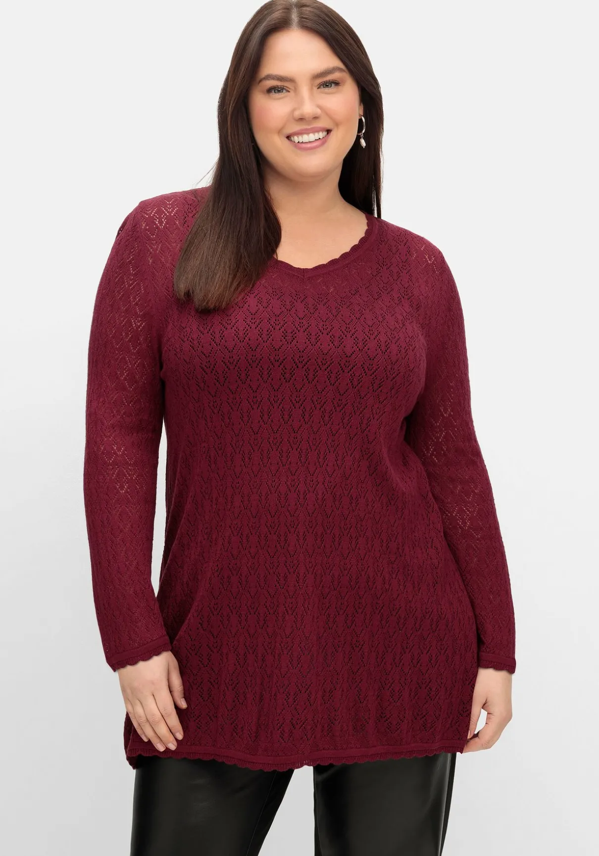 Pullover aus Ajourstrick. Das zarte Strickmuster verleiht ihm eine feminine, leicht transparente Optik. Der Pullover ist in dezenter A-Linie geschnitten und besitzt einen streckenden V-Ausschnitt. Bogenkanten an allen Abschlüssen dienen als verspieltes Finish.