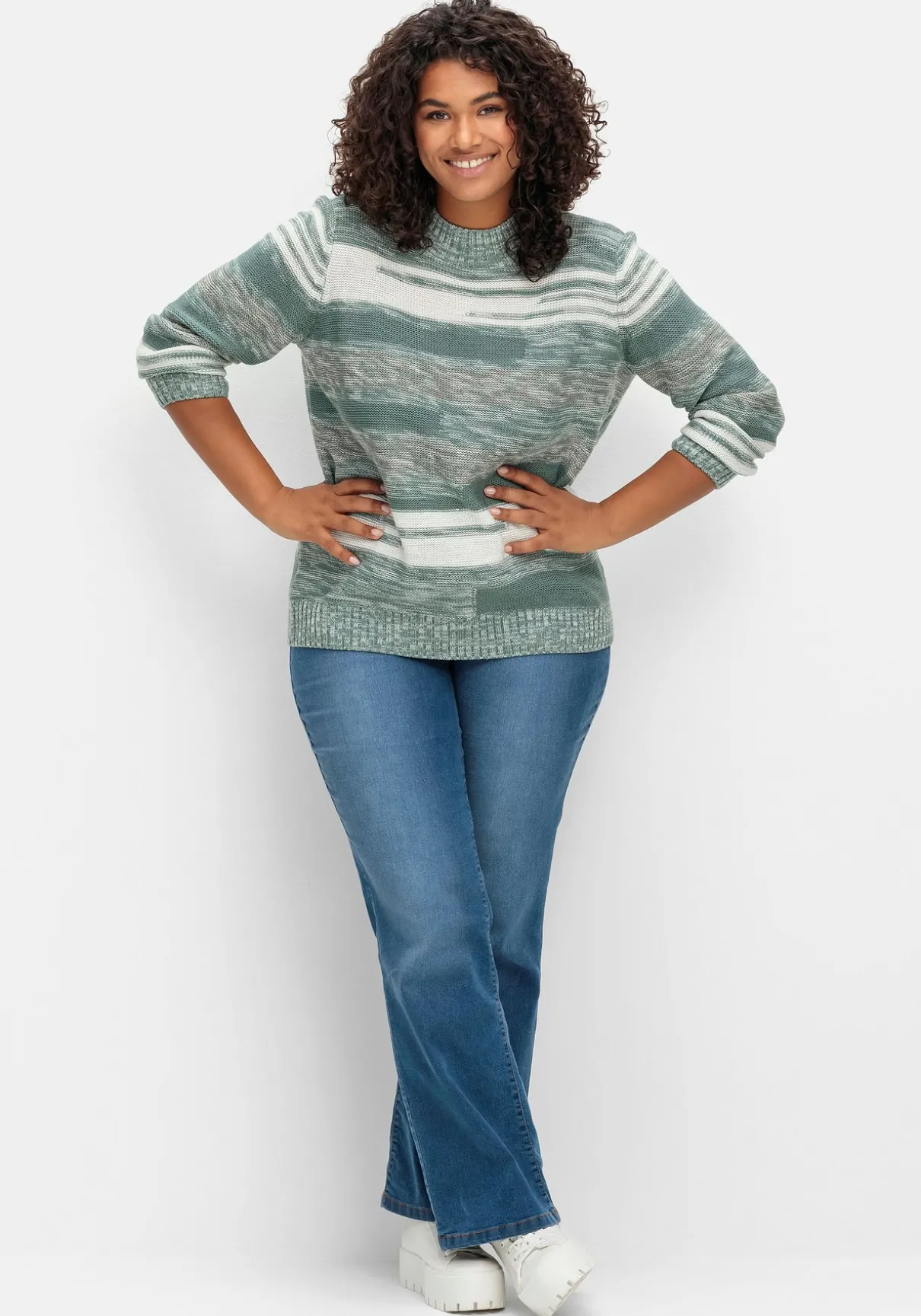 Pullover im Linksstrick. Der Wechsel zwischen der feinen Melange und den markanten Blockstreifen sorgt für Modernität. Der Stehkragen sowie der Arm- und Saumabschluss heben sich durch die gerippten Bündchen sportiv ab.