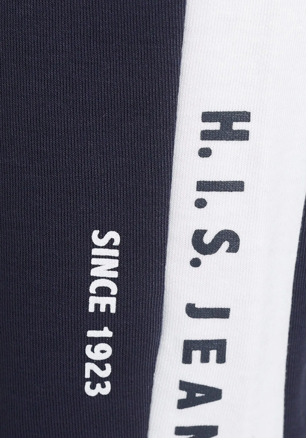 Sportliche Relaxhose von H.I.S. Breite Kontraststreifen mit Labelprint am Abschluss. Seitliche Eingrifftaschen. Elastischer Kordelzugbund. Für Freizeit und Sport. Weiche Interlockqualität.