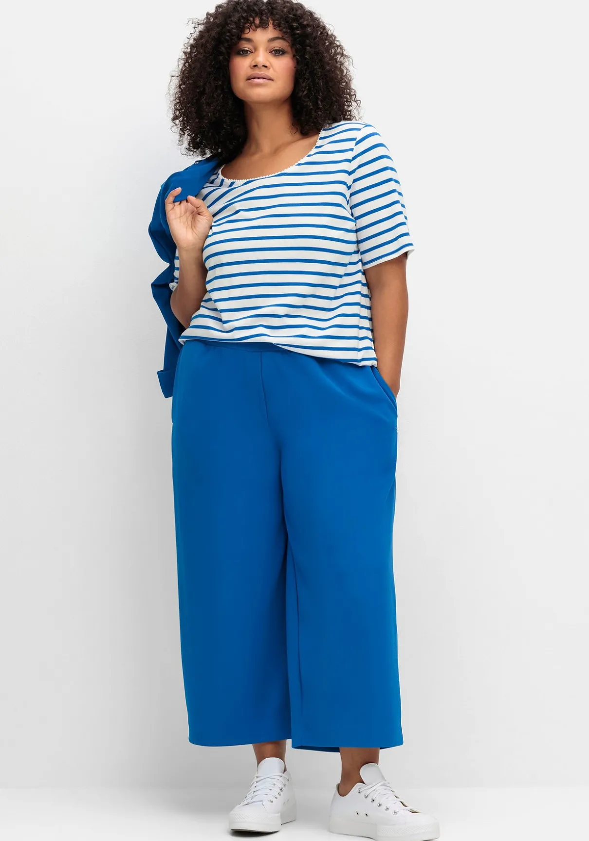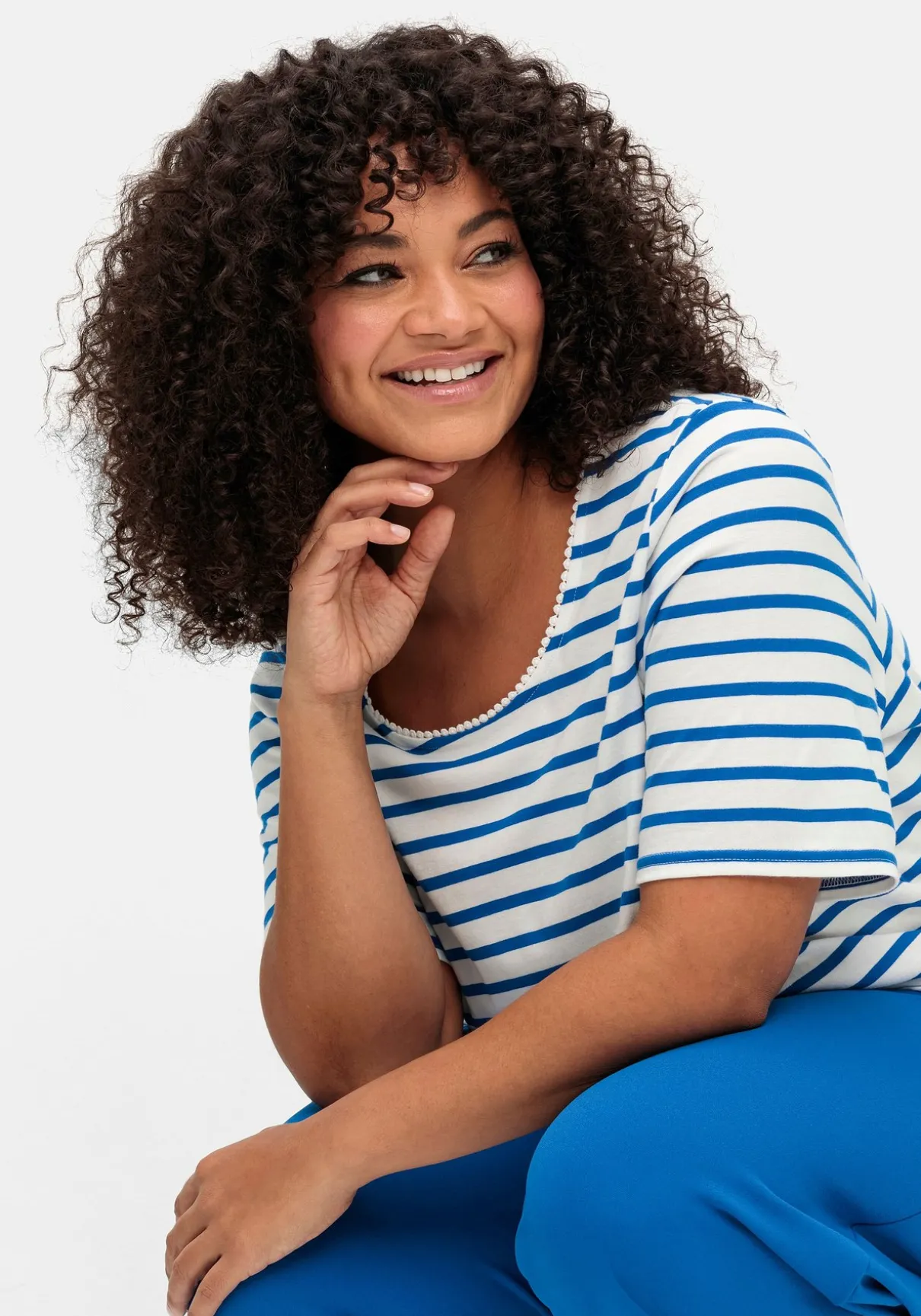 Shirt mit garngefärbten Ringeln. Das maritime Streifenmuster wird durch eine schmale Spitzenborte am Rundhalsausschnitt feminin ergänzt. Das Shirt ist mit halblangen Ärmeln gearbeitet, der gerade Saum endet mit seitlichen Schlitzen.