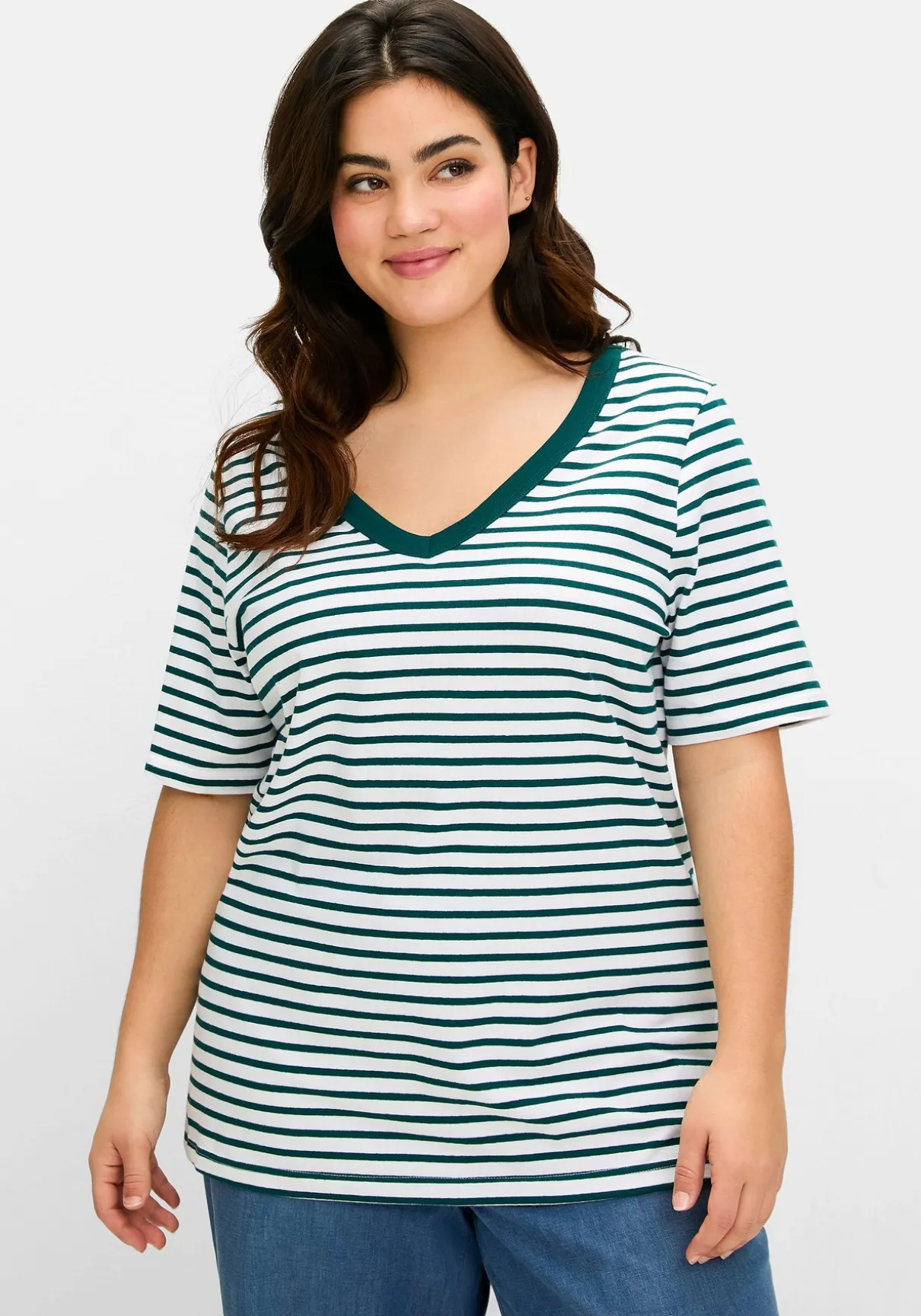 Shirt mit garngefärbten Ringeln. Der V-Ausschnitt wird durch die farblich abgesetzte Blende sportiv betont, die breit gerippte Struktur verleiht der Oberfläche Spannung. Ein etwas längerer Halbarm und die gerade Passform machen den Look komplett.