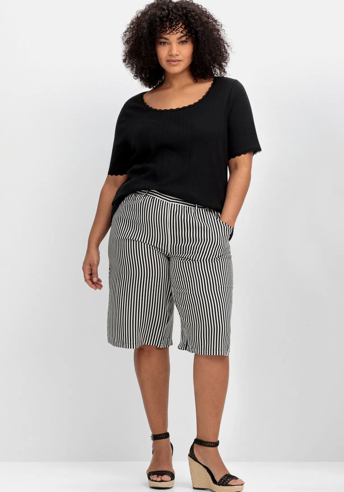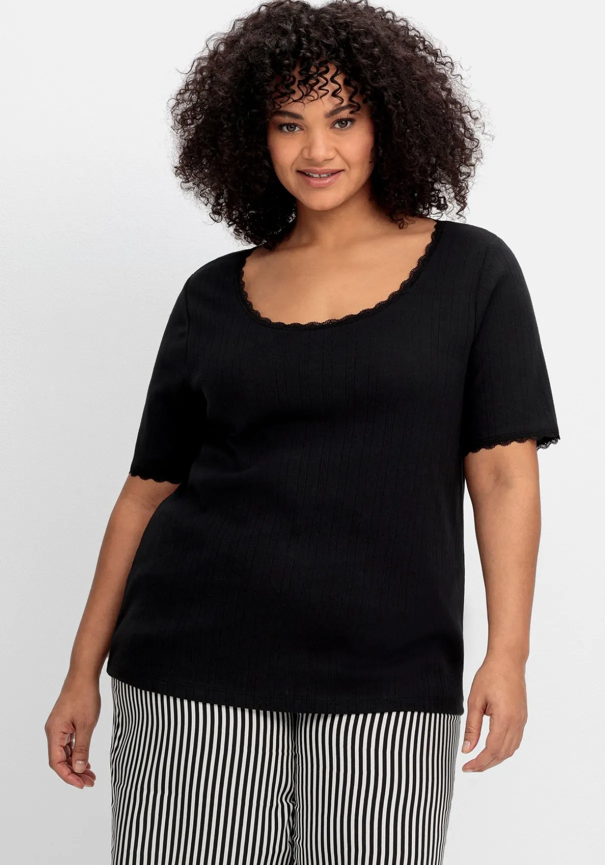 Shirt in Rippqualität. Das zarte Ajourmuster verleiht dem Shirt eine verspielte, romantische Optik. Die Spitzenkante am etwas weiter gefassten Rundhalsausschnitt sowie am Ärmelsaum dient als feminines Finish.