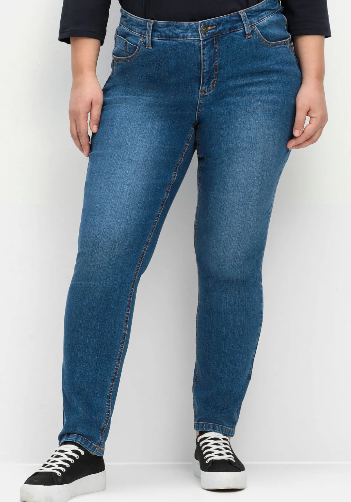 Slim Fit Jeans in Curvy-Schnitt VERENA. Der komfortable Fit ist perfekt auf die Figur mit schmaler Taille, viel Po und kräftigen Oberschenkeln zugeschnitten. Waschung und Kontrastnähte verleihen der Jeans eine legere Optik. Der Formbund mit Gürtelschlaufen sowie die klassische 5-Pocket-Form runden den Look ab.