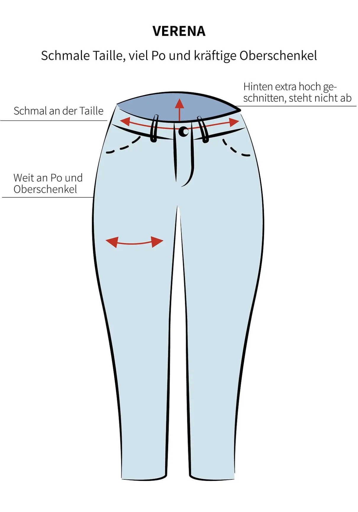 In schmaler Slim Fit Beinform. Die Passform VERENA ist schmal an der Taille und weit an Po und Oberschenkel geschnitten. Durch den hinten höheren Schnitt steht die Hose auch im Sitzen nicht ab, die Passe schmeichelt der Figur zusätzlich.
