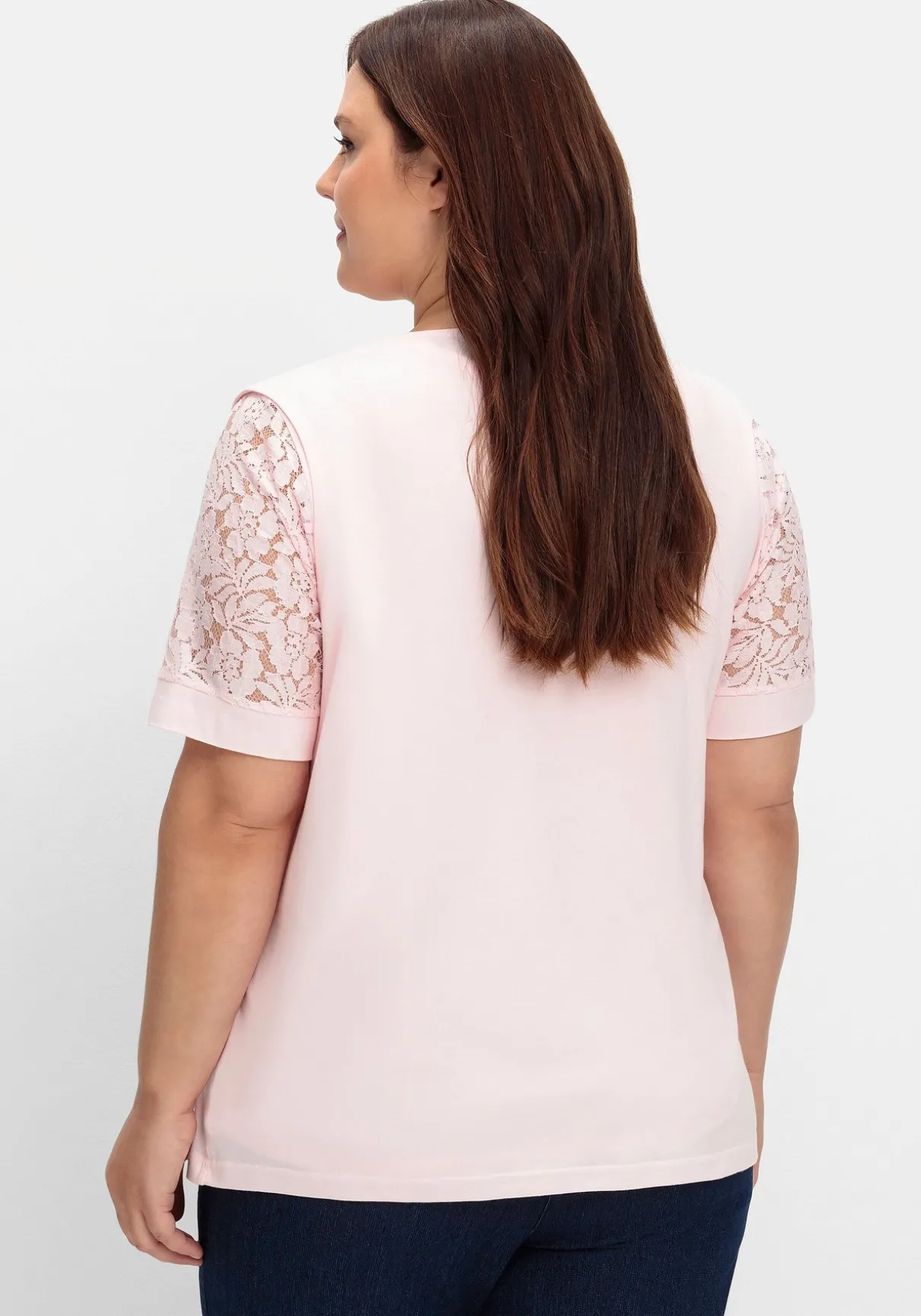 Set aus Shirt und Weste. Ob einzeln oder im Lagenlook – das Set wirkt entspannt und feminin zugleich. Blickfang ist die transparente Spitze an den Ärmeln, die mit einer Jerseyblende abgeschlossen wird. Die offene Form der Weste fällt locker über das Shirt und schmeichelt der Figur.