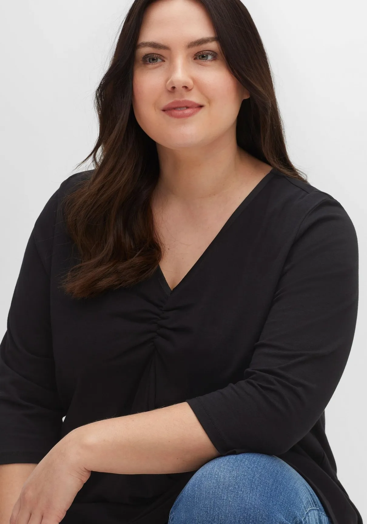 Das Oberteil und die 3/4-Ärmel sind locker geschnitten, das Faltendetail vorn verleiht dem Oberteil bequeme Weite. In hüftumspielender Länge.