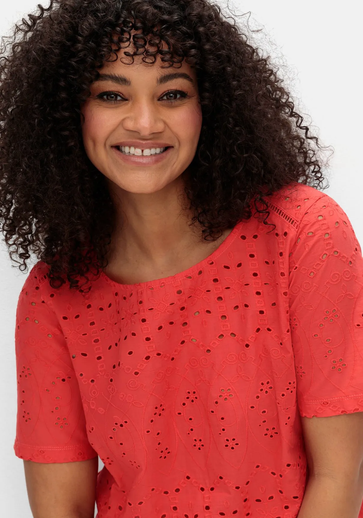 Das Vorderteil ist aus reiner Baumwolle gefertigt, der Rücken besteht aus elastischem Single-Jersey. Da die Lochspitze das Shirt vorn leicht transparent macht, empfehlen wir, es mit einem Unterziehtop zu kombinieren.