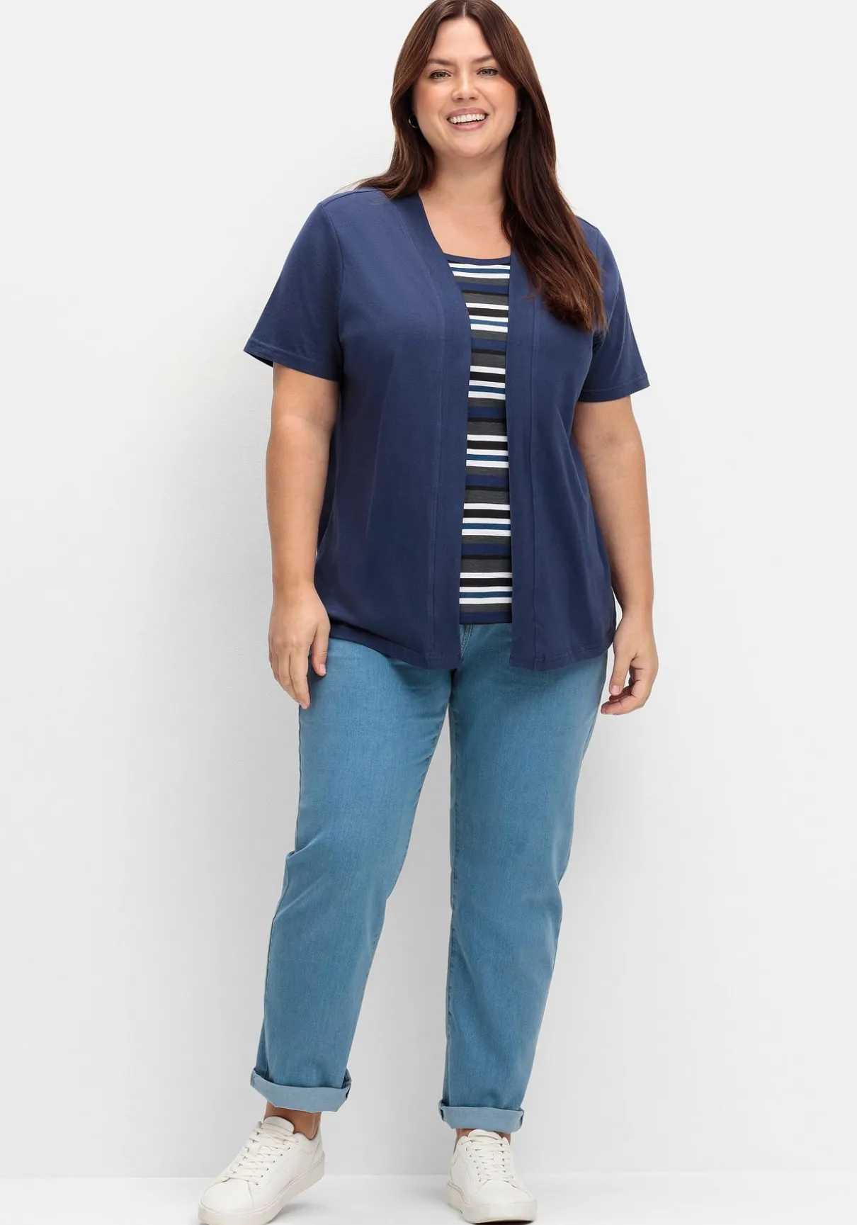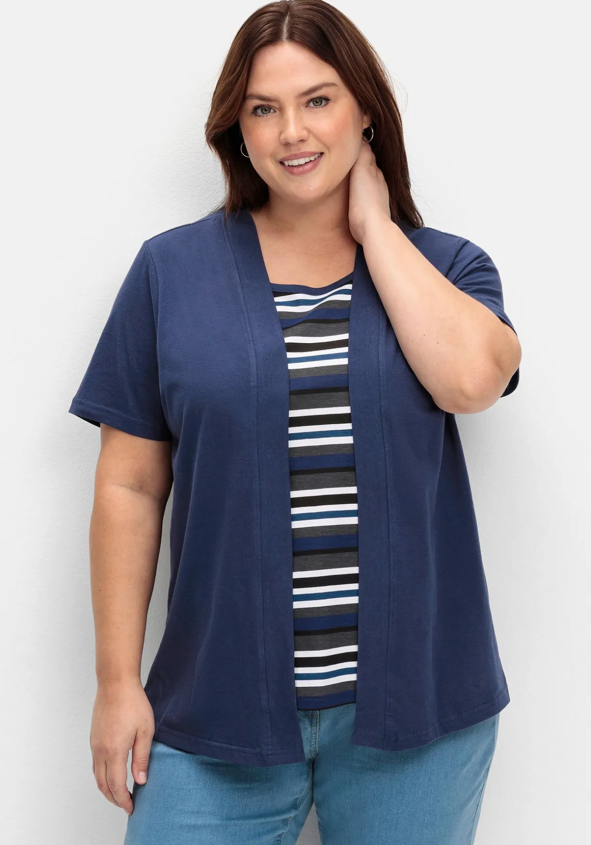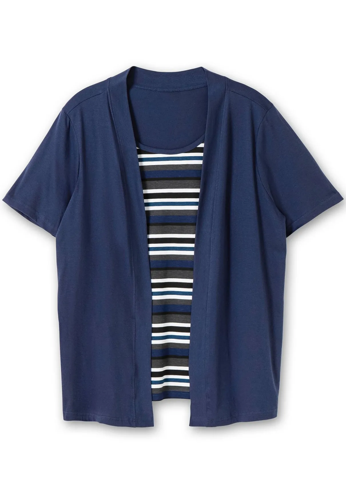 Shirt in 2-in-1-Optik. Das Shirt ist mit kurzen Ärmeln und einem paspelierten Schalkragen gearbeitet. Der etwas kürzer gehaltene gestreifte Einsatz darunter lässt die raffinierte 2-in-1-Optik entstehen.