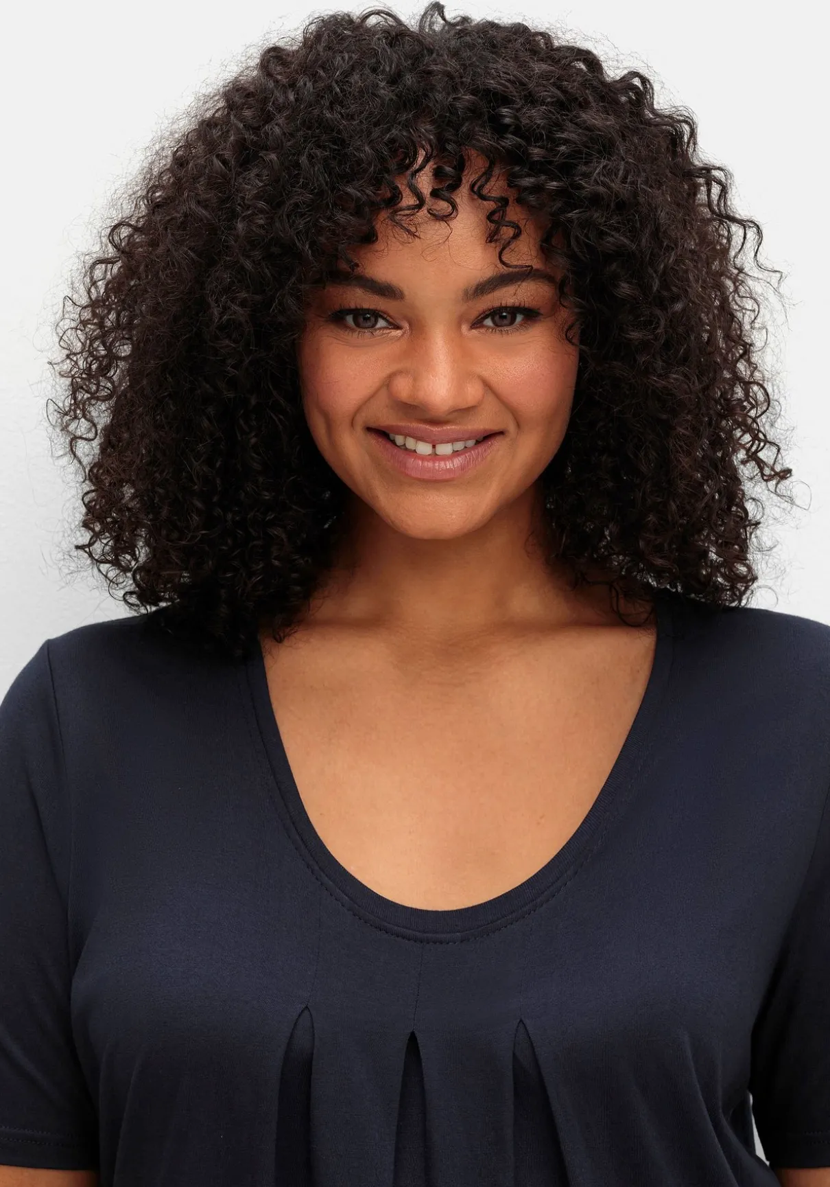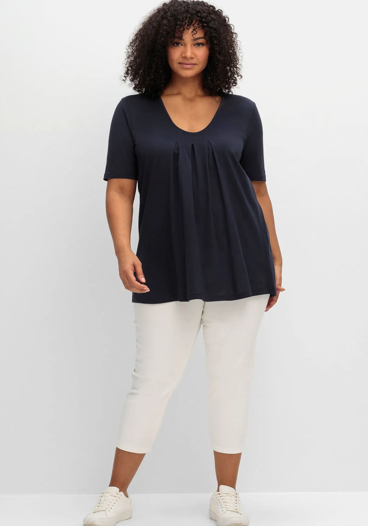 Shirt in A-Linie. Feminin wirken die drei Kellerfalten auf Brusthöhe. Im Zusammenspiel mit der ausgestellten A-Silhouette sorgen sie für einen lockeren Fall. Der leicht verlängerte Kurzarm schmeichelt den Oberarmen.