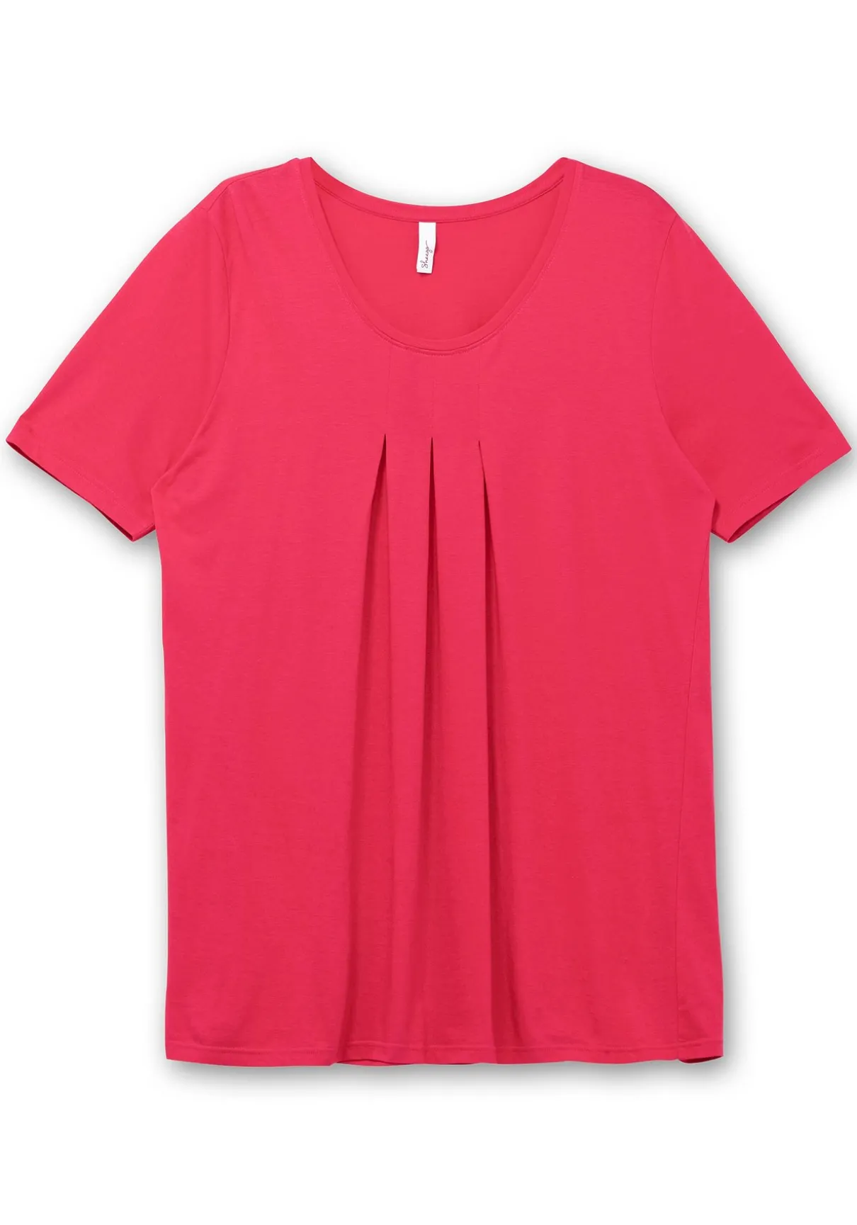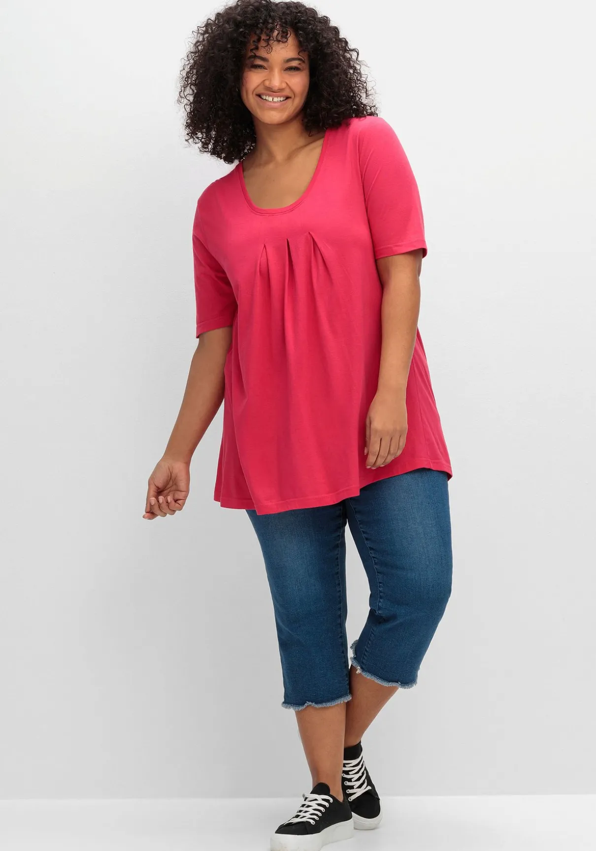 Shirt in A-Linie. Feminin wirken die drei Kellerfalten auf Brusthöhe. Im Zusammenspiel mit der ausgestellten A-Silhouette sorgen sie für einen lockeren Fall. Der leicht verlängerte Kurzarm schmeichelt den Oberarmen.