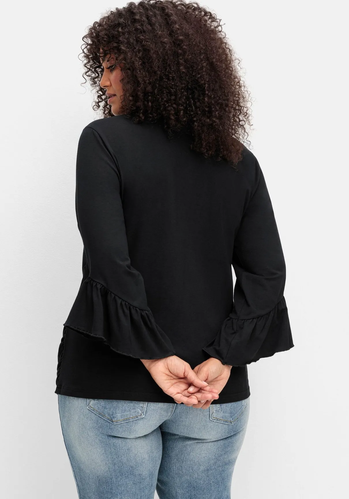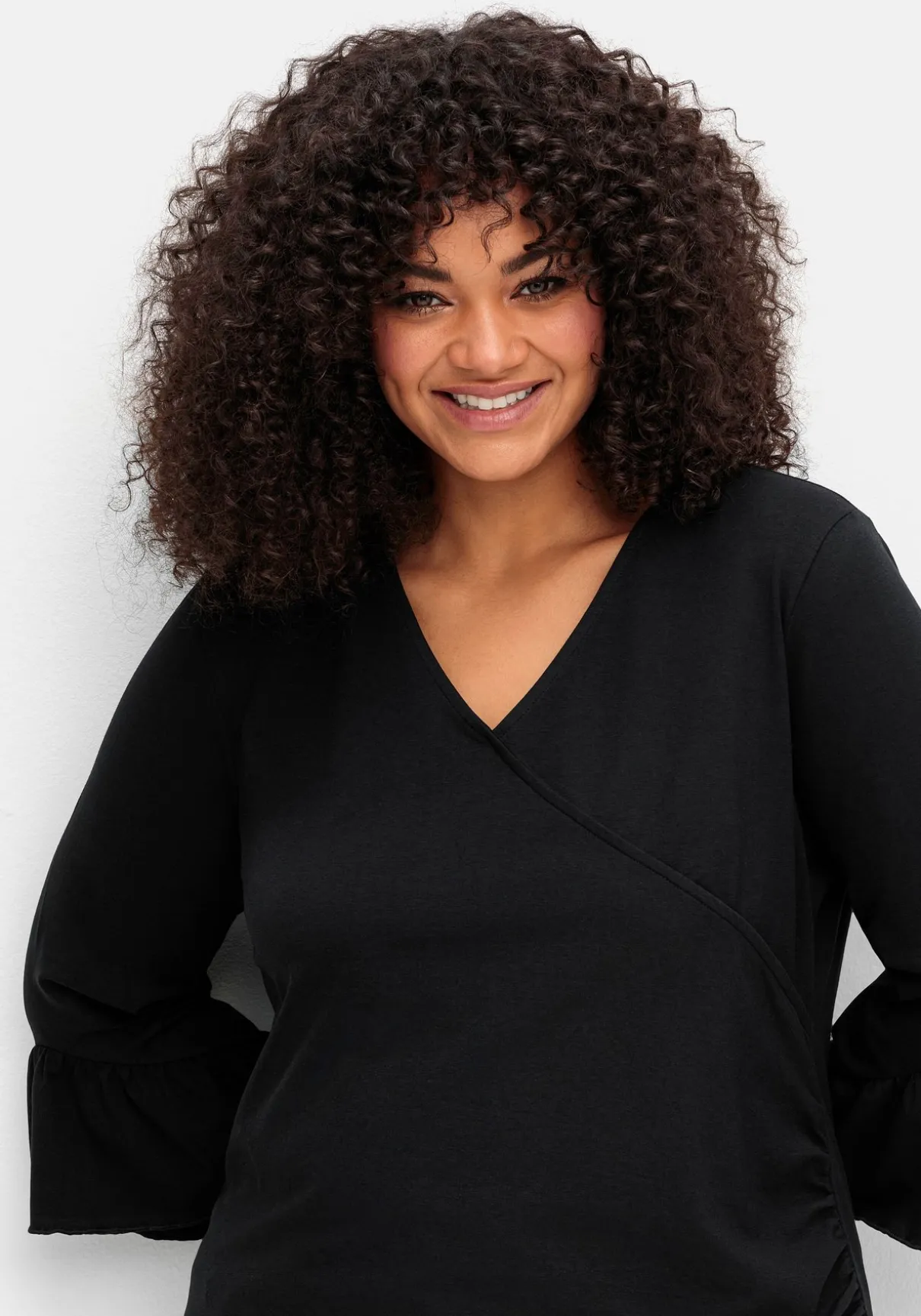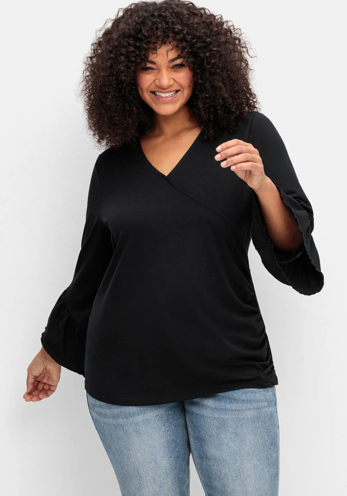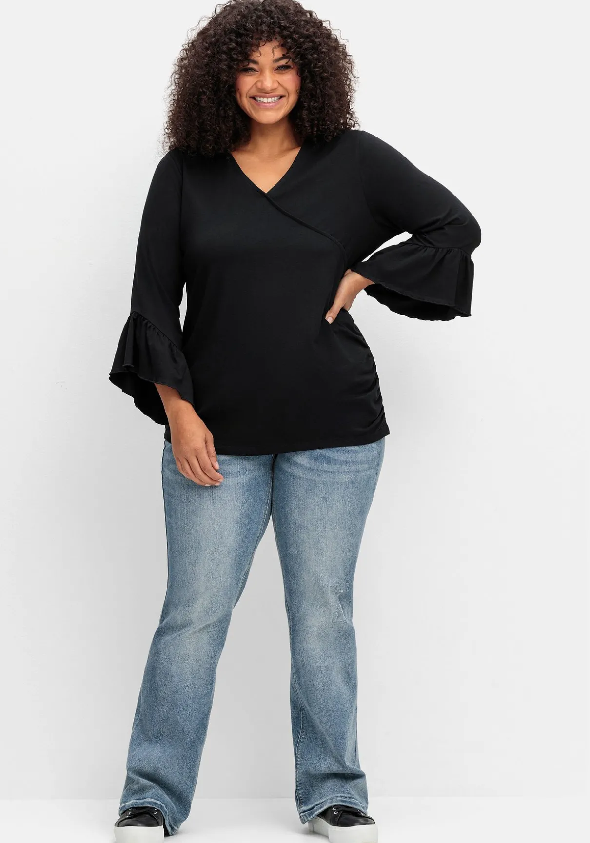 Shirt in Wickeloptik von sheego by Joe Browns. Zusammen mit dem V-Ausschnitt entsteht eine feminine Optik, die gleichzeitig geschickt den Oberkörper streckt. Die elastische Raffung in der Seitennaht unterstreicht den verspielten Look. Die 3/4-langen Ärmel werden durch die angesetzten Volants dekorativ verziert.
