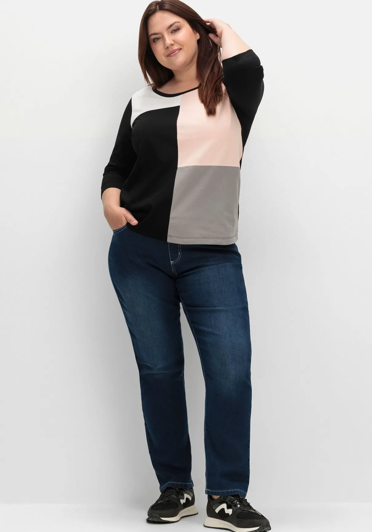 Shirt mit 3/4-Arm. Durch den grafischen Patchwork-Print vorn auf dem Body erhält das Shirt einen modernen, trendstarken Look. Die unifarben gehaltenen Ärmel und das Rückenteil setzen sich davon kontraststark ab. Ein paspelierter Rundhalsausschnitt ergänzt den Fit.