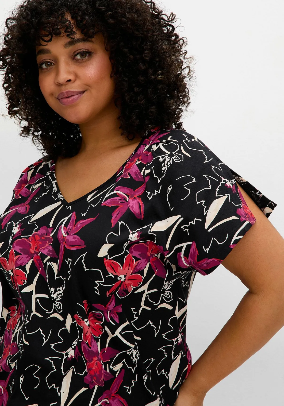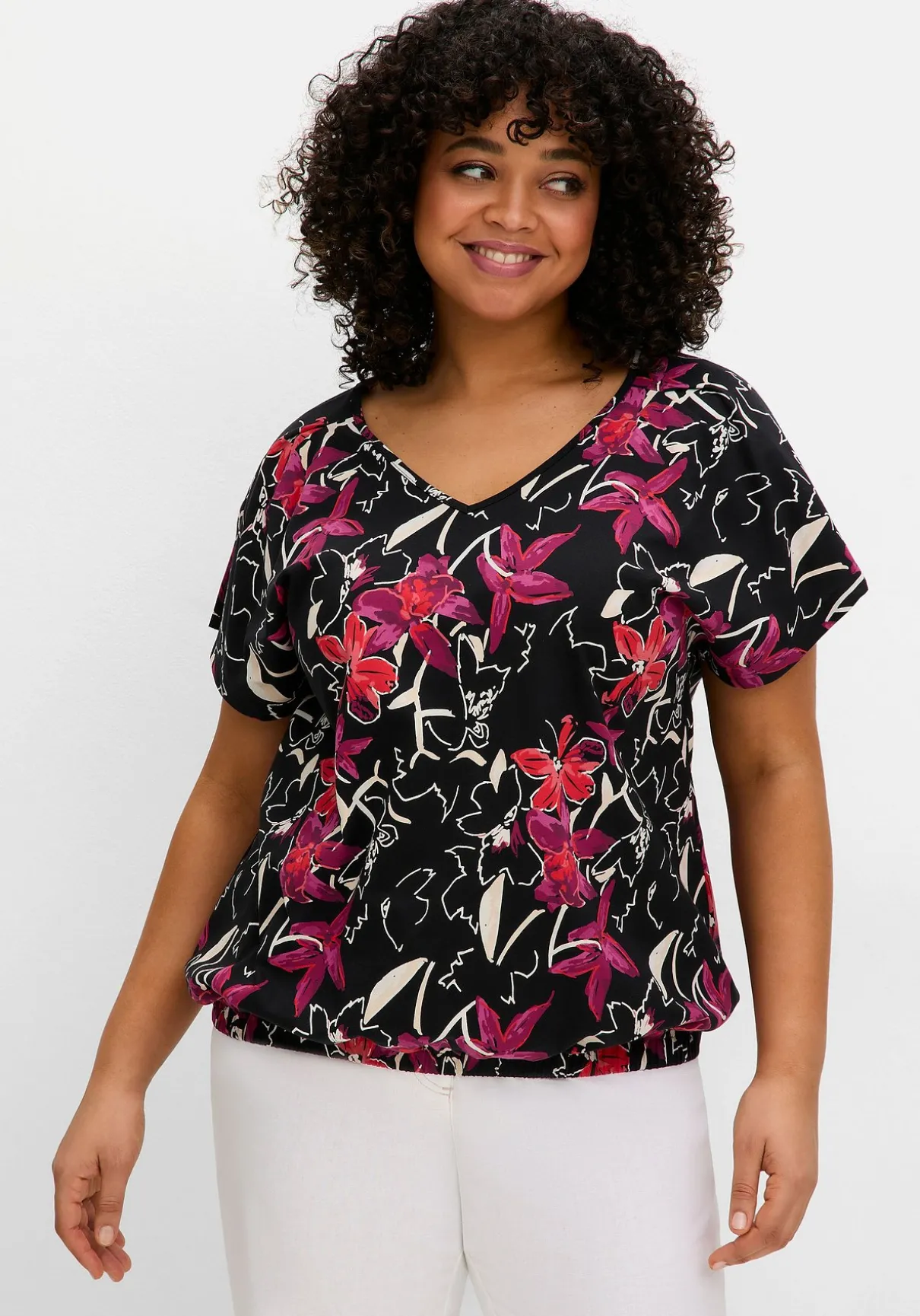 Shirt mit Alloverdruck. Die überschnittenen Ärmel sind auf den Schultern raffiniert geschlitzt, Kellerfalten seitlich am etwas tieferen V-Ausschnitt unterstreichen den femininen Look. Ein Gummizugbund fasst den lockeren Schnitt am Saum zusammen und gibt dem Shirt so mehr Weite im Bauchbereich.