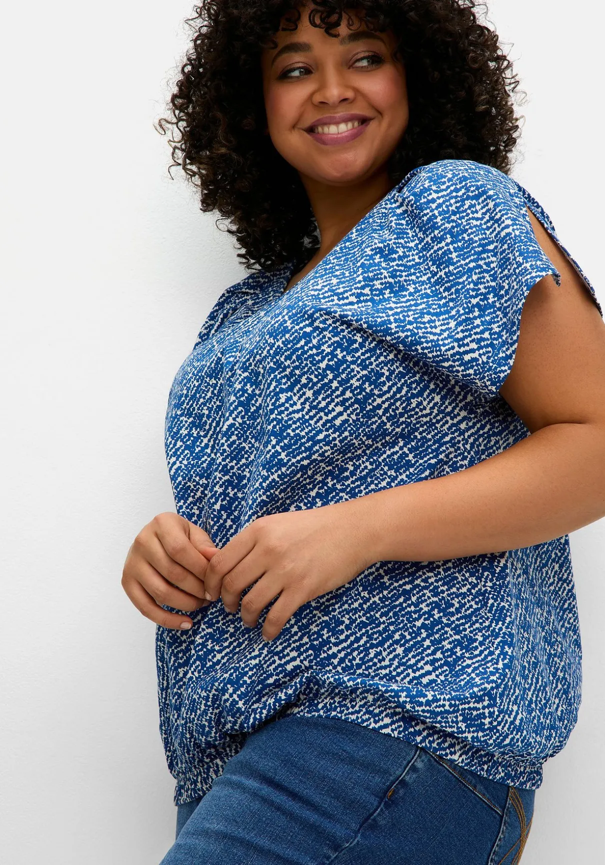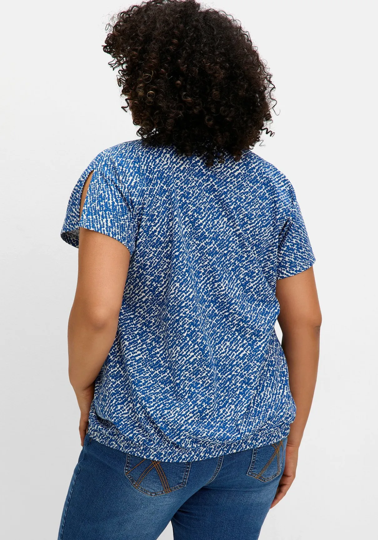 Shirt mit Alloverdruck. Die überschnittenen Ärmel sind auf den Schultern raffiniert geschlitzt, Kellerfalten seitlich am etwas tieferen V-Ausschnitt unterstreichen den femininen Look. Ein Gummizugbund fasst den lockeren Schnitt am Saum zusammen und gibt dem Shirt so mehr Weite im Bauchbereich.