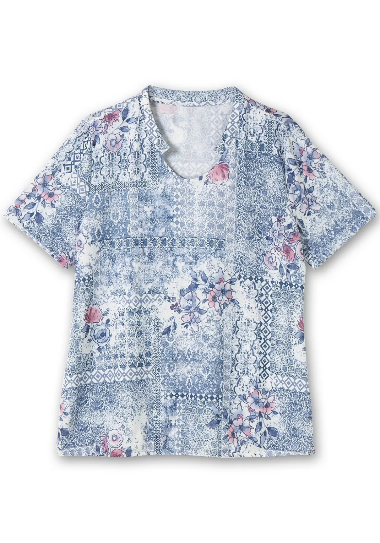Shirt mit Alloverdruck. Der dekorative Unikatprint mit floralen Elementen macht jedes Teil so einzigartig und wird durch die pflegeleichte Qualität in Strick-Optik besonders hervorgehoben. Mit seinem kleinen Stehkragen und dem leicht abgerundeten V-Ausschnitt erhält es femininen Charme. Dazu sorgt der Gummizug im Saum für einen lockeren Fall, der dezent die Bauchpartie schmeichelt.