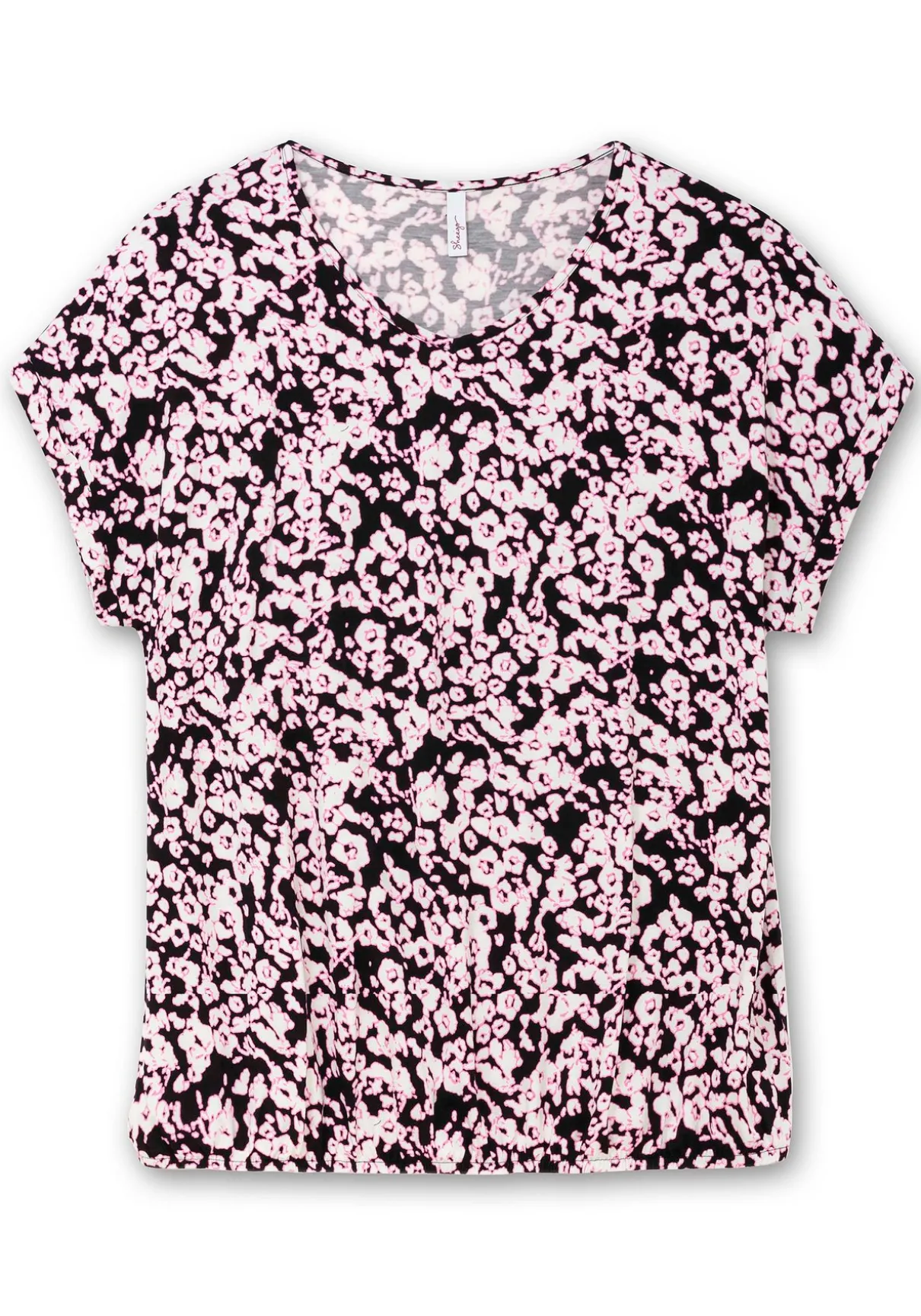 Shirt mit floralem Print. Zum filigranen Blumenmuster setzt der fixierte, unifarbene Ärmelaufschlag einen modischen Kontrast. Dazu kommen ein streckender V-Ausschnitt und leger überschnittene Schultern. Der Gummizugbund fasst den lockeren Schnitt am Saum zusammen und lässt rund um die Bauchpartie bequeme Weite entstehen.