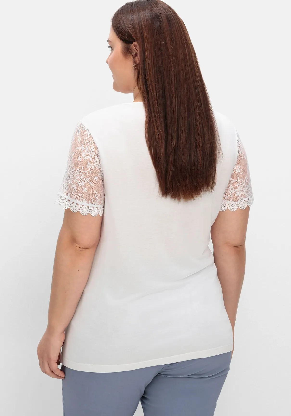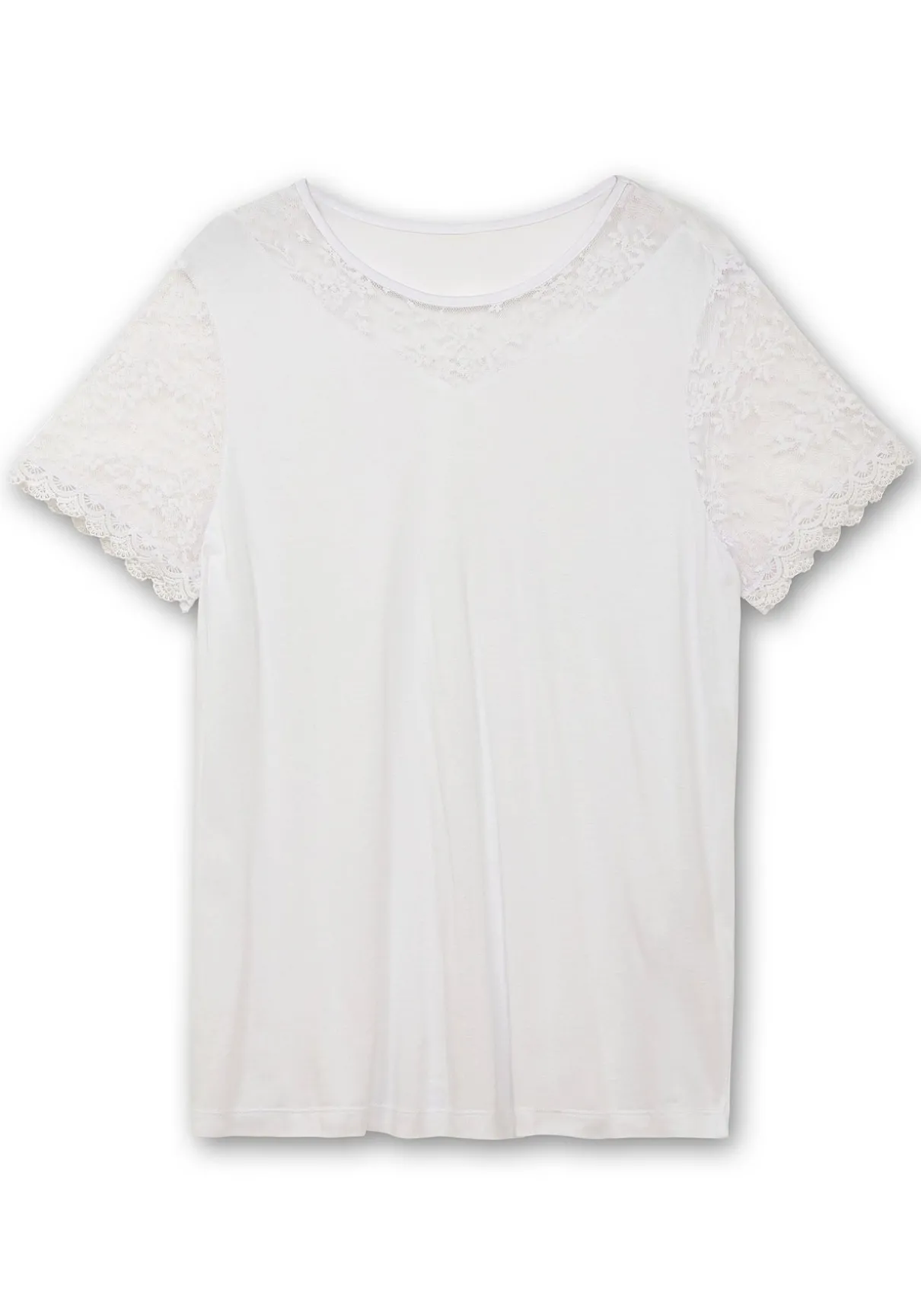 Shirt in leicht taillierter Form. Der Rundhalsausschnitt und die kurzen Ärmel setzen sich durch die leicht transparente, florale Spitze feminin ab. Zusätzlich werden die Ärmelabschlüsse durch Spitzenbordüren dekorativ betont.