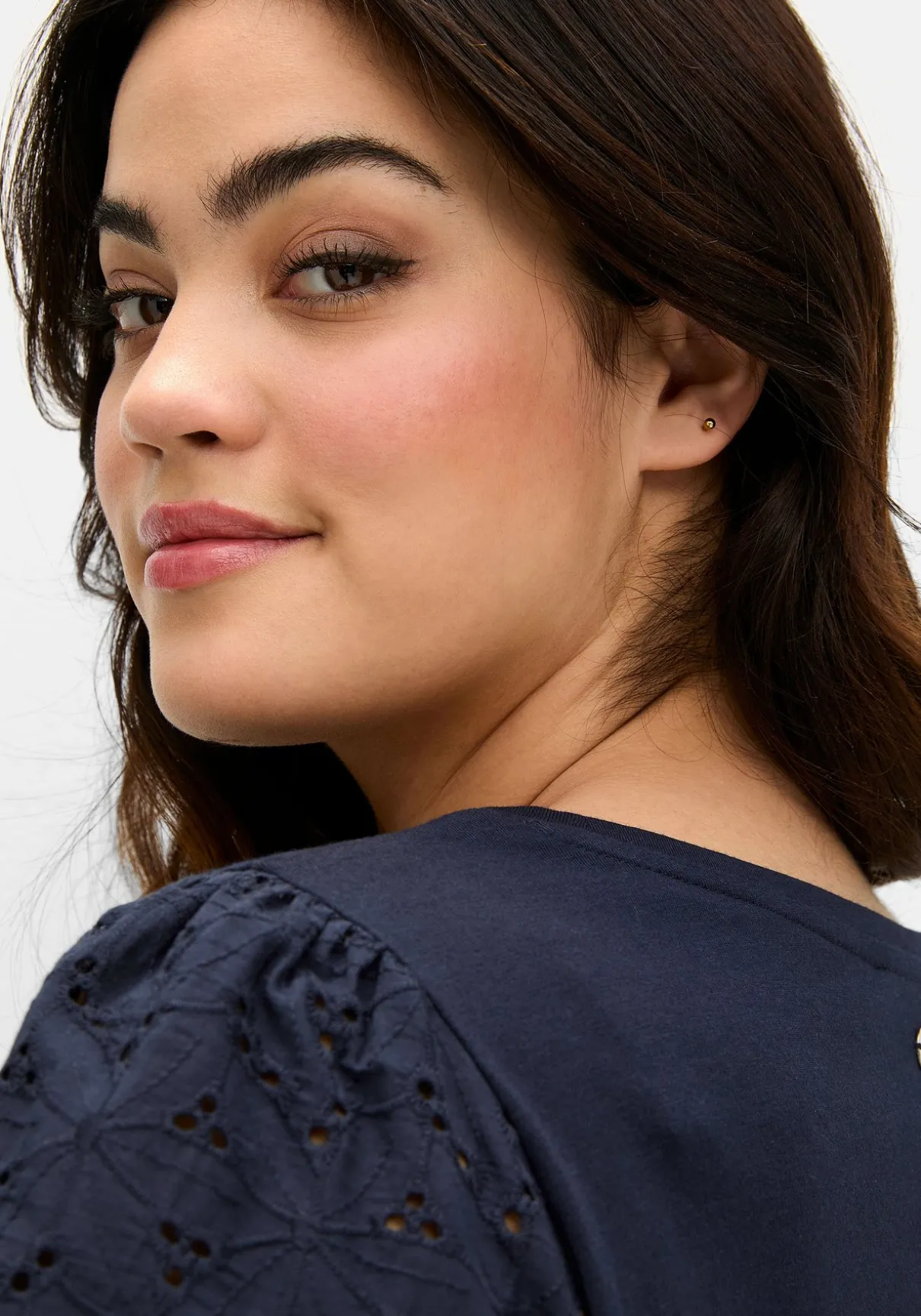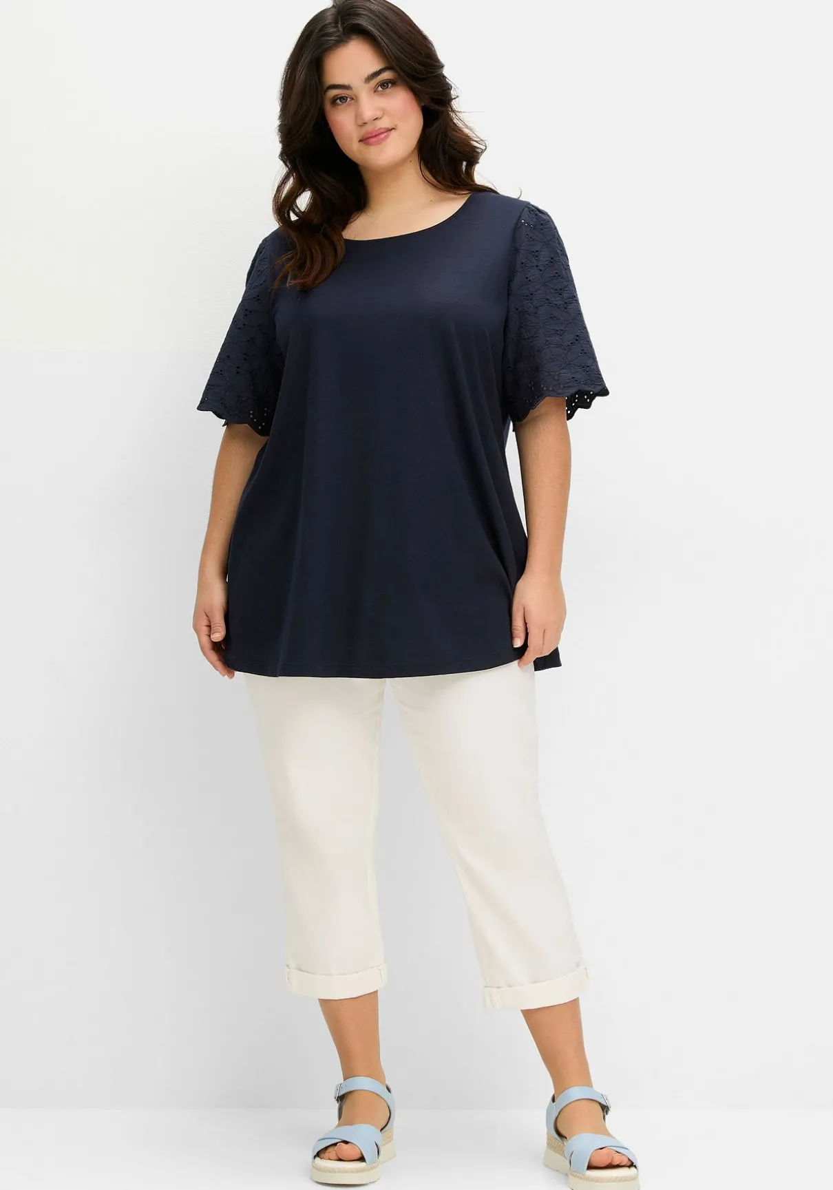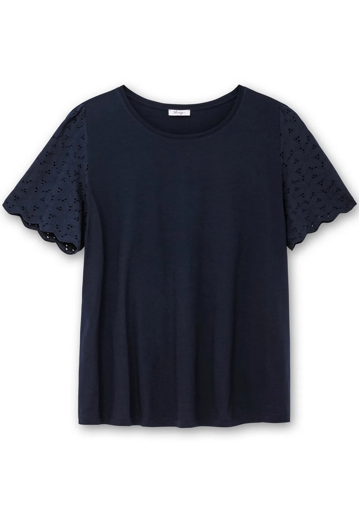Shirt mit Rundhalsausschnitt. Die kurzen, aus Lochspitze gearbeiteten Flügelärmel zaubern einen femininen Look, eine Bogenkante am Ärmelsaum ist dazu eine hübsche Ergänzung.