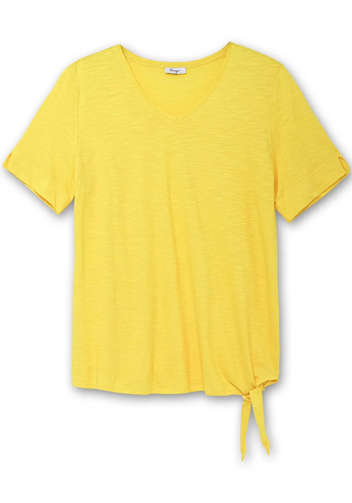 Shirt aus Flammgarn-Jersey. Das Oberteil ist mit streckendem V-Ausschnitt und kurzen Ärmeln gearbeitet, ein kurzer Schlitz am Ärmelsaum sorgt für Bequemlichkeit. Raffinierter Blickfang sind die zum Knoten gebundenen Bänder am Saumabschluss.