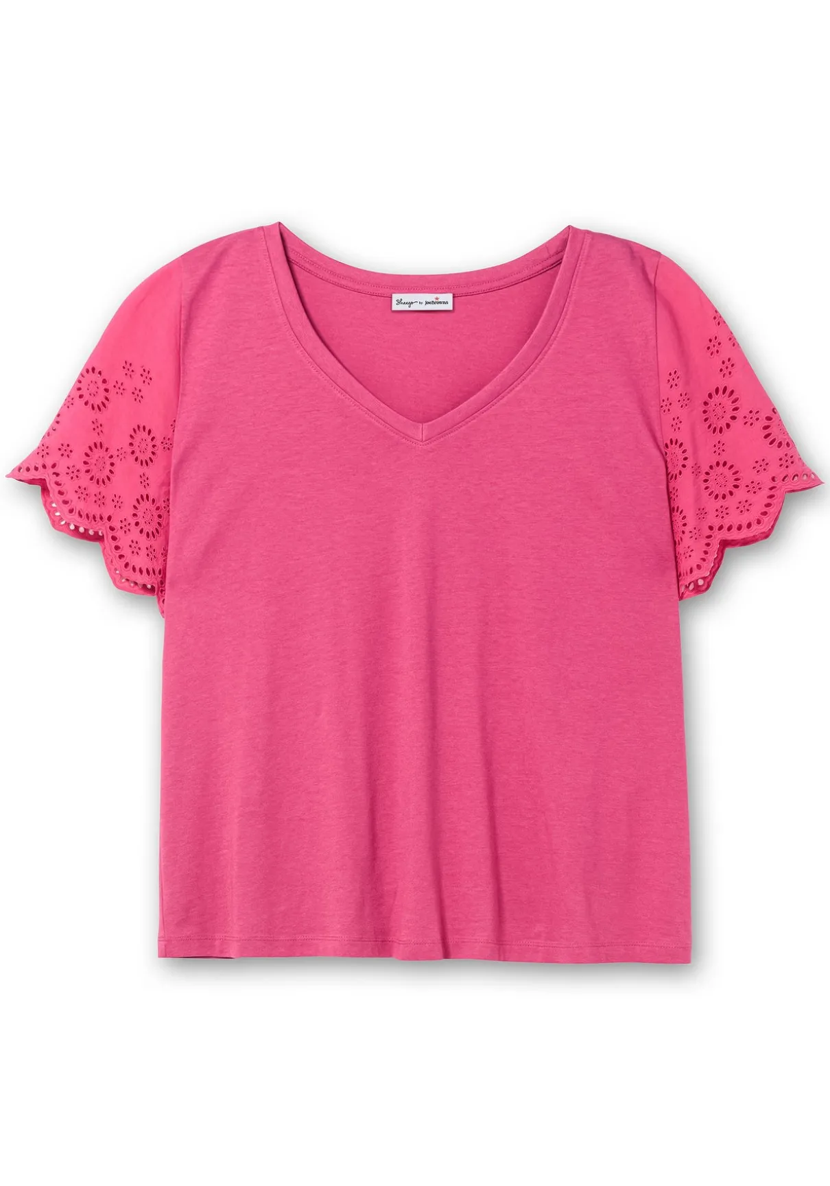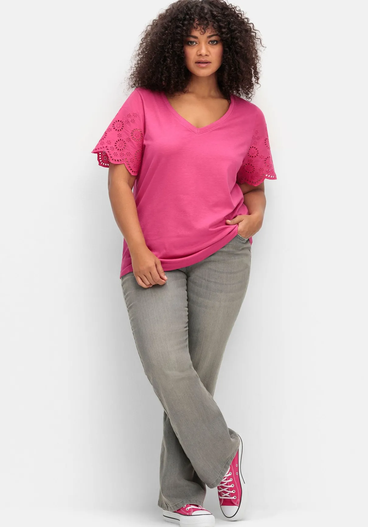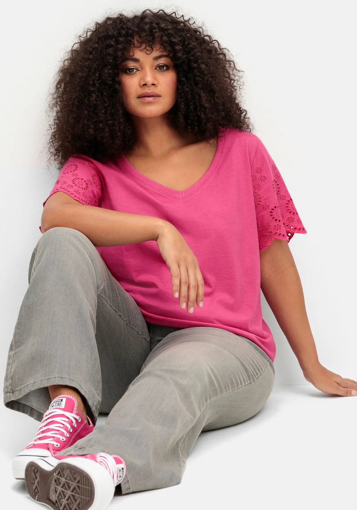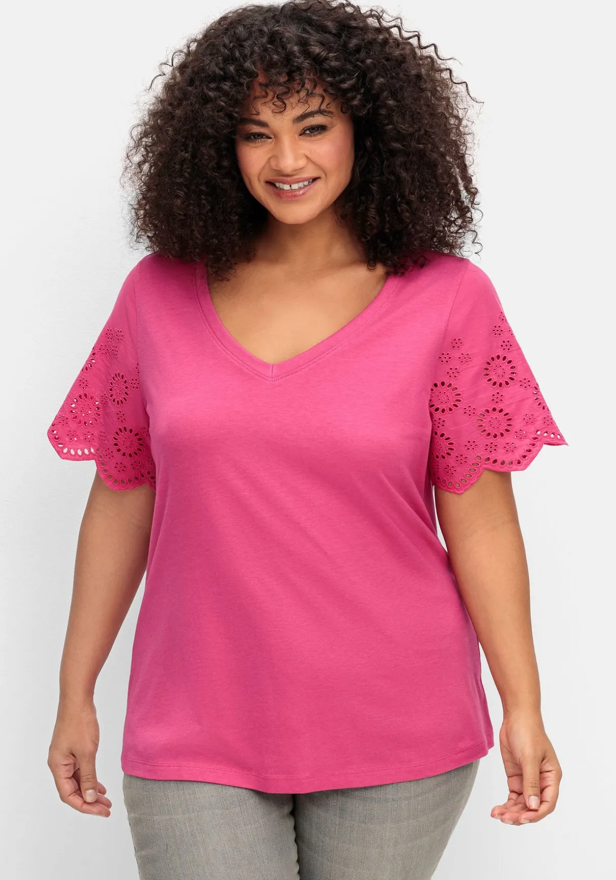Shirt von sheego by Joe Browns. Blickfang sind die kurzen, mit Lochstickereien und gezackter Muschelsaumkante gearbeiteten Ärmel. Der etwas tiefere V-Ausschnitt ist mit Rippbündchen eingefasst, die leicht taillierte Schnittform macht den femininen Auftritt perfekt.