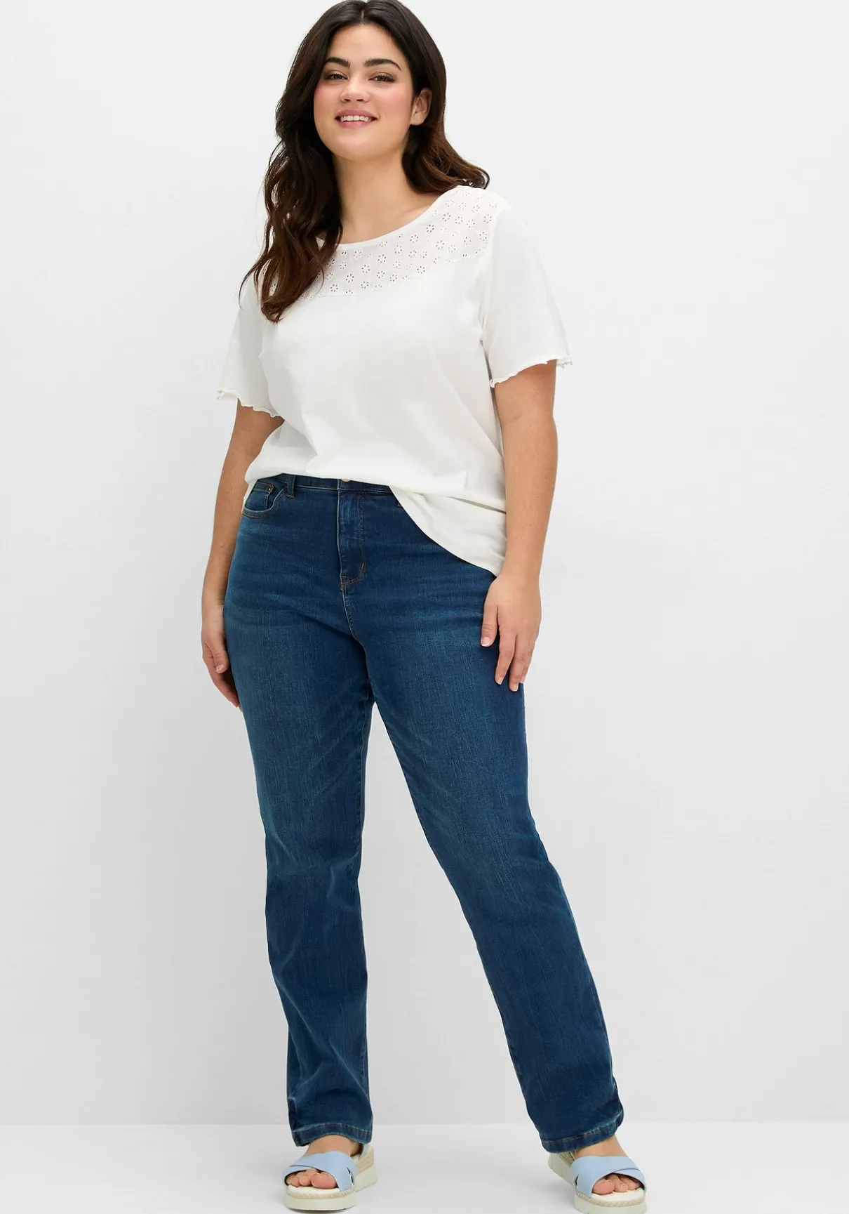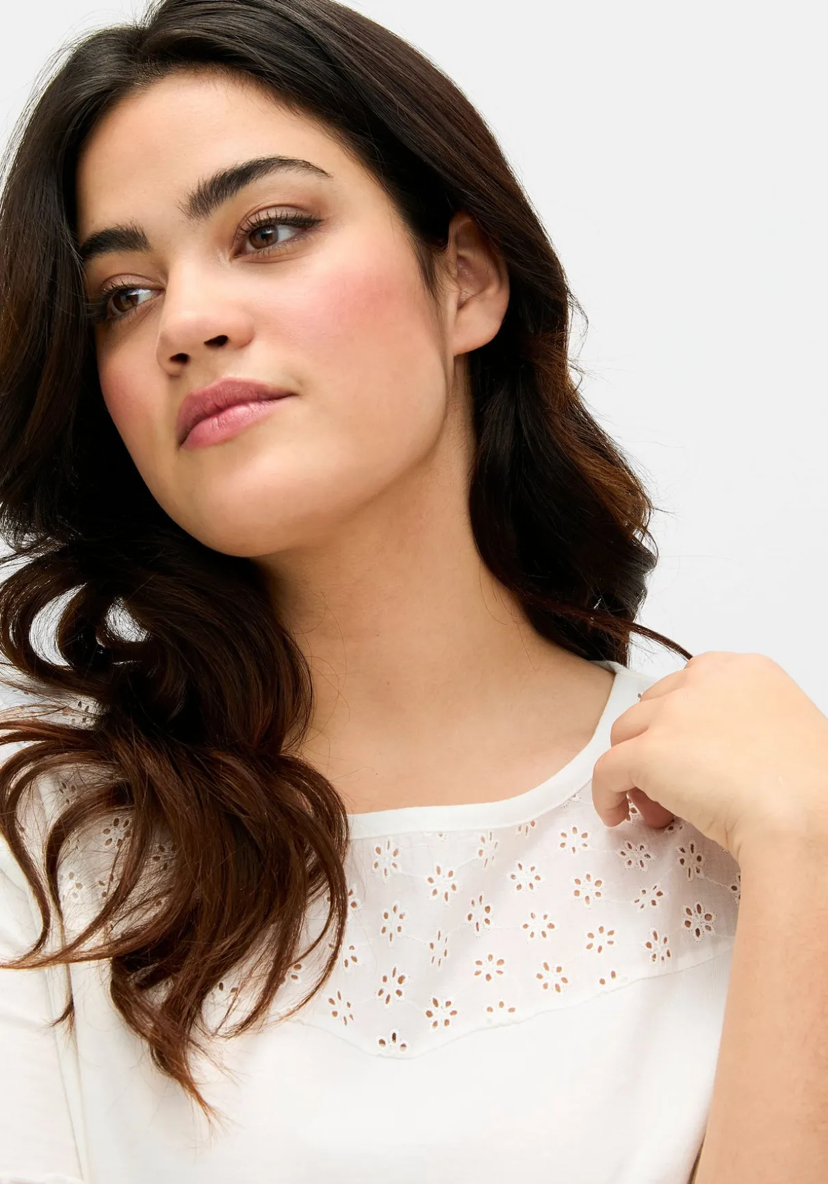 Shirt mit dekorativem Web-Einsatz vorn. Unterhalb des Rundhalsausschnitts sorgt ein Einsatz aus hübscher Lockstickerei für feminine Akzente. Babylock-Ziernähte an den Armelabschlüssen sind dazu eine verspielte Ergänzung.