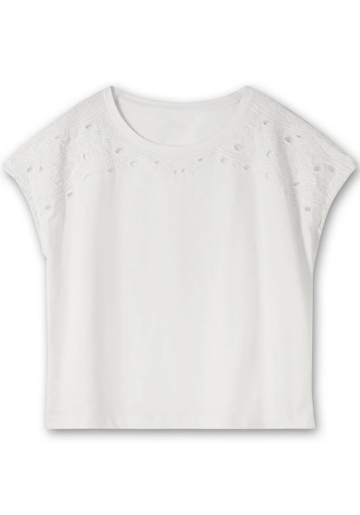 Kurzarmshirt mit Rundhalsausschnitt. Der schlichte Style wird durch die dekorative Lochstickerei feminin aufgewertet. Durch die überschnittenen Ärmel erhält das Oberteil einen modernen Charakter.