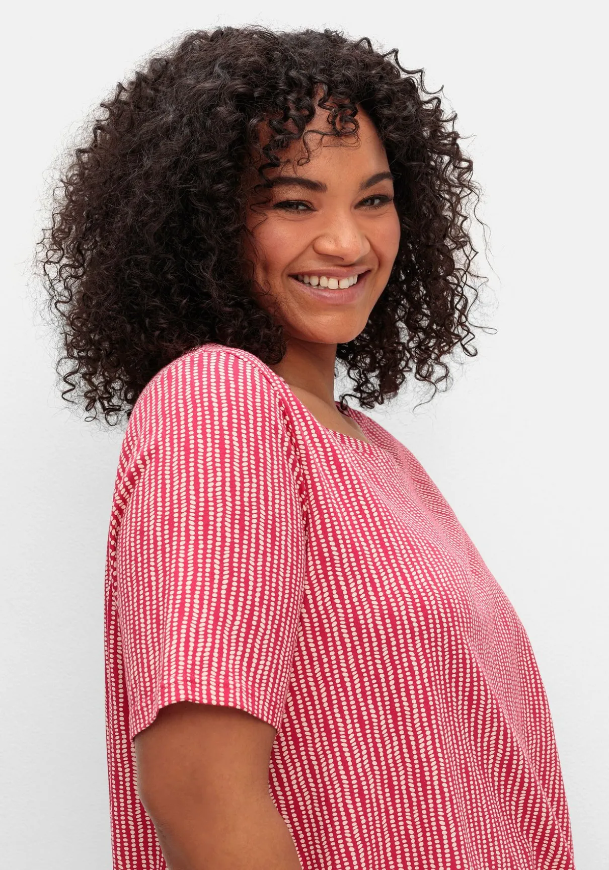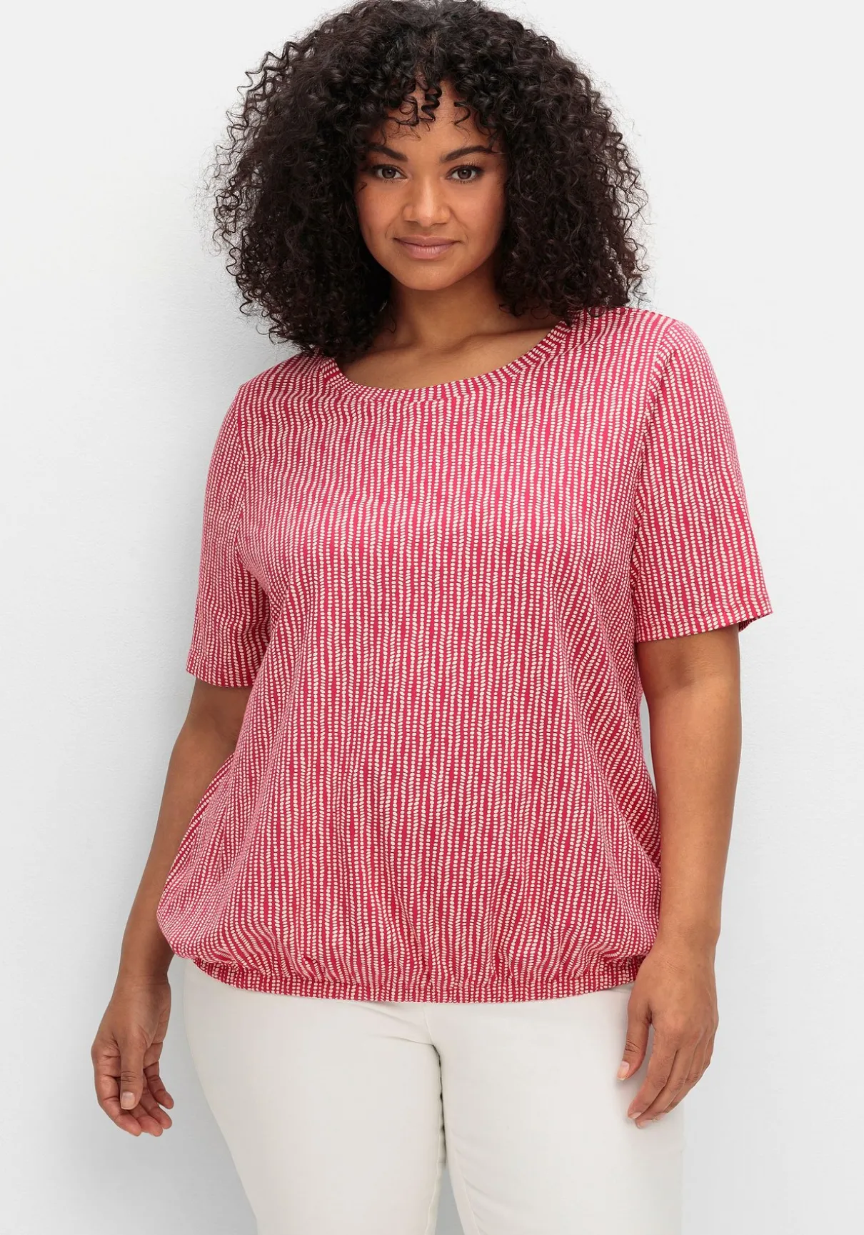 Gemustertes Shirt mit Rundhalsausschnitt. Der feine Alloverdruck verleiht dem Oberteil eine optisch streckende Längsstruktur. Dazu schmeichelt der modisch verlängerte Kurzarm den Oberarmen, der Gummizugbund am Saum sorgt für eine sportiv-lässige Note.