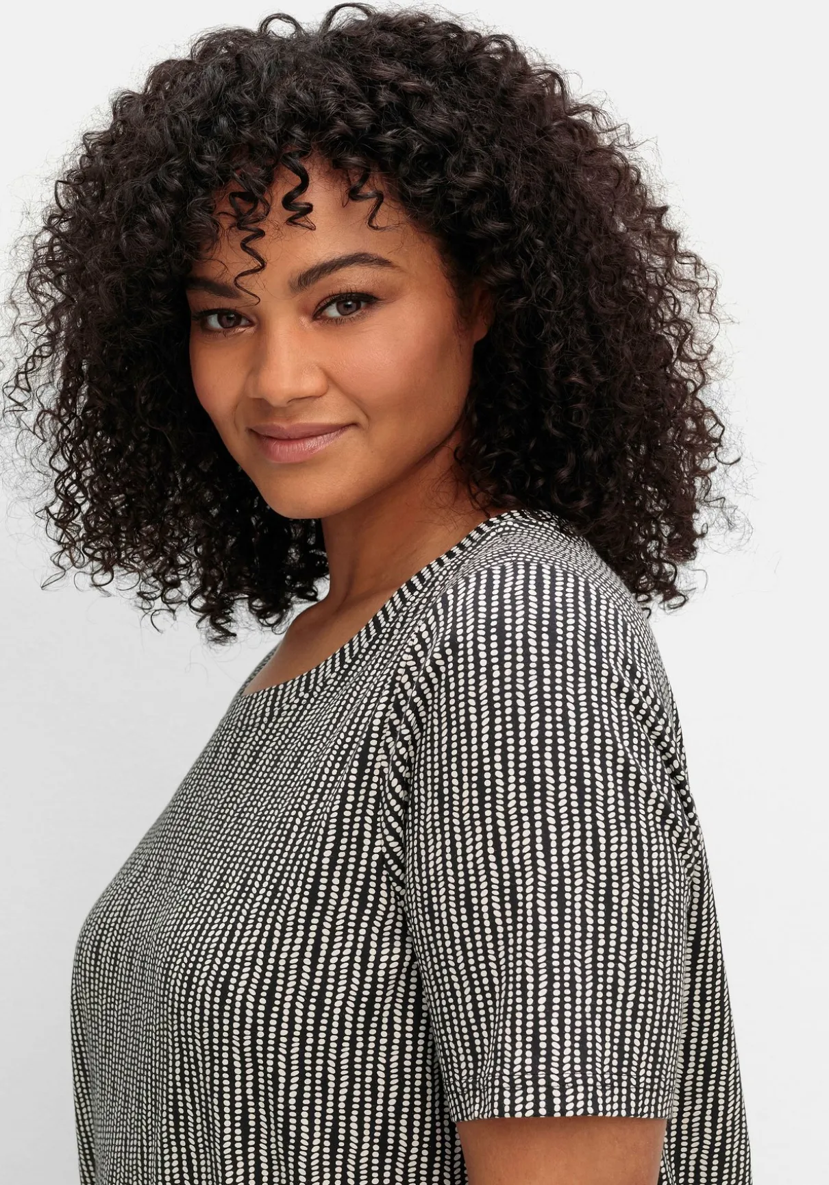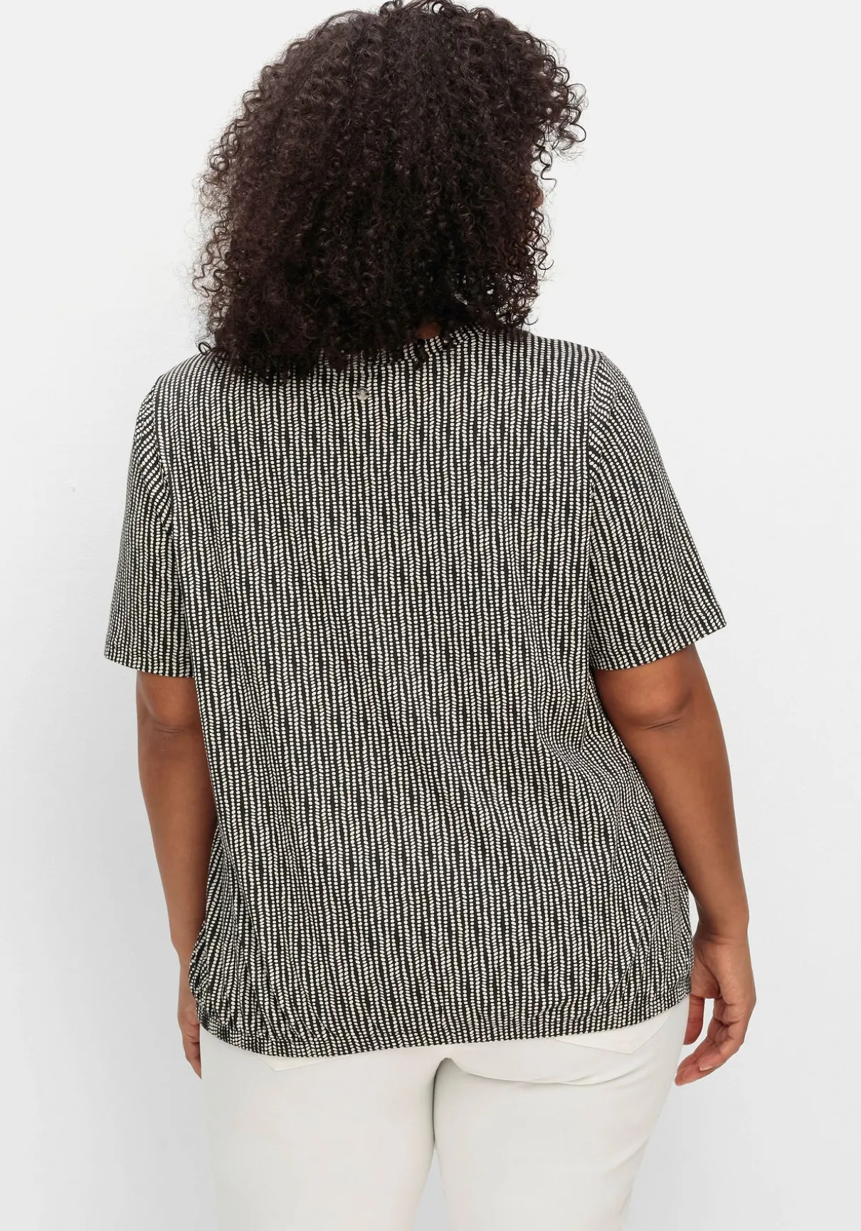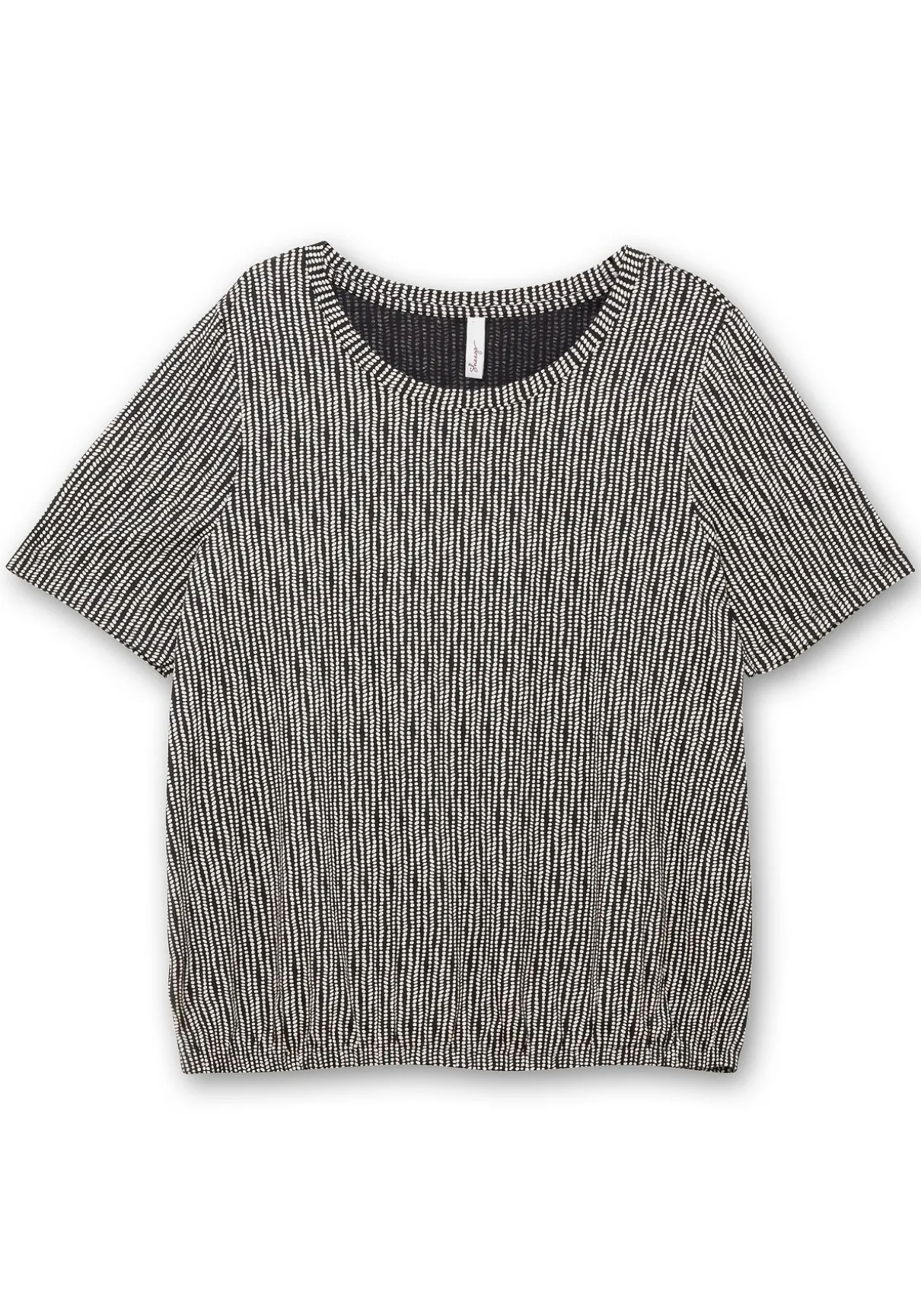 Gemustertes Shirt mit Rundhalsausschnitt. Der feine Alloverdruck verleiht dem Oberteil eine optisch streckende Längsstruktur. Dazu schmeichelt der modisch verlängerte Kurzarm den Oberarmen, der Gummizugbund am Saum sorgt für eine sportiv-lässige Note.