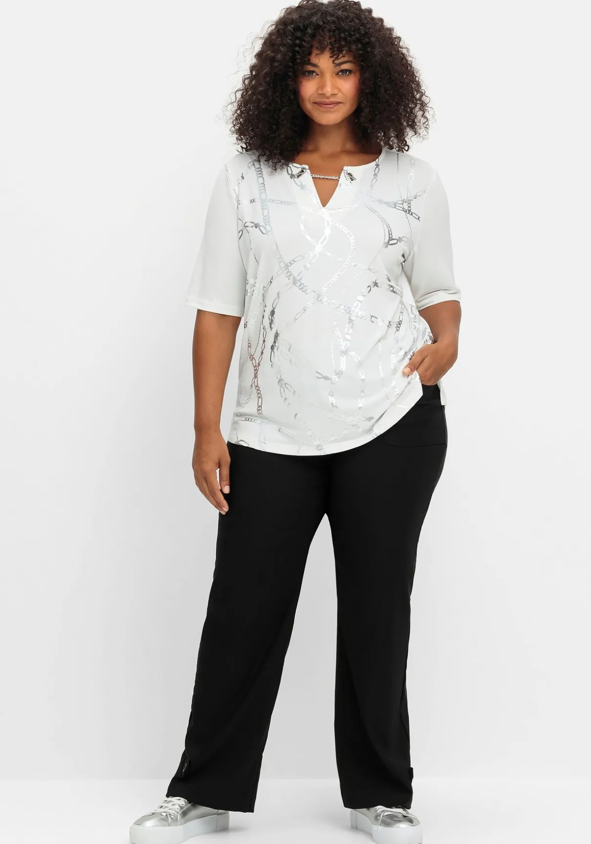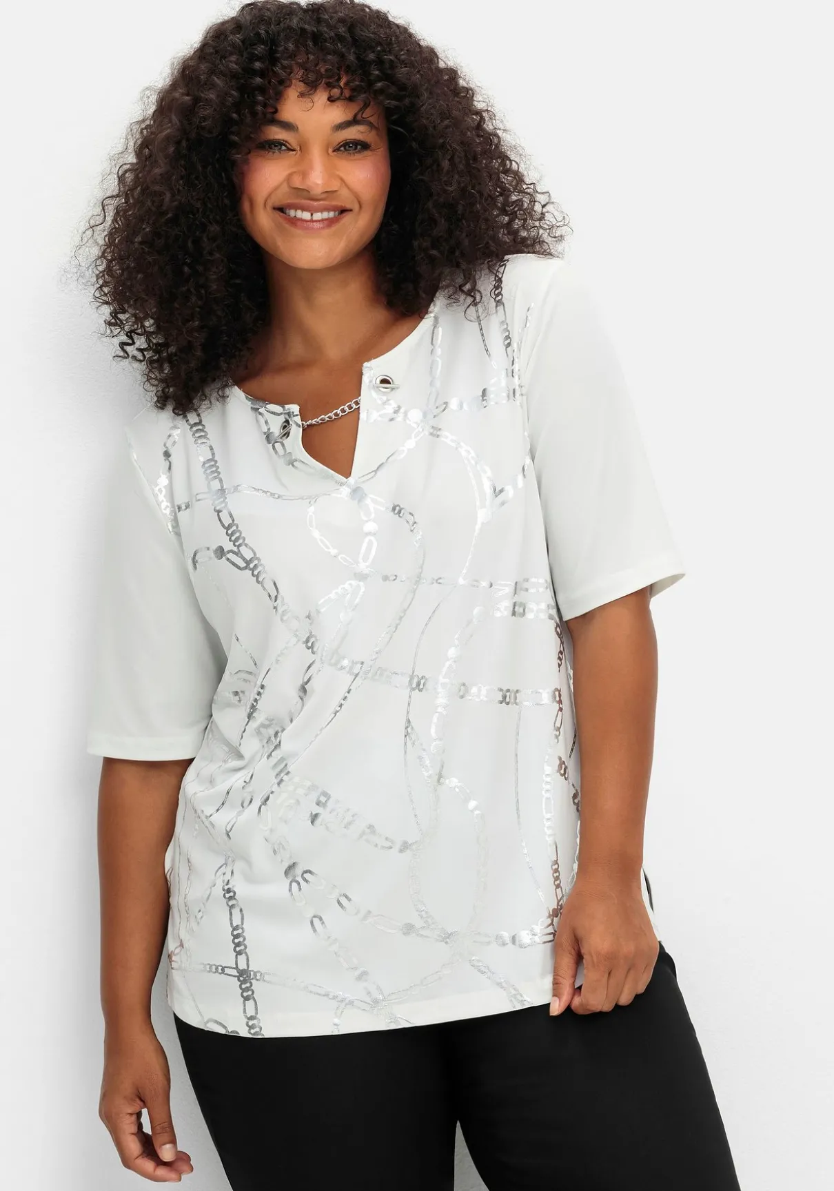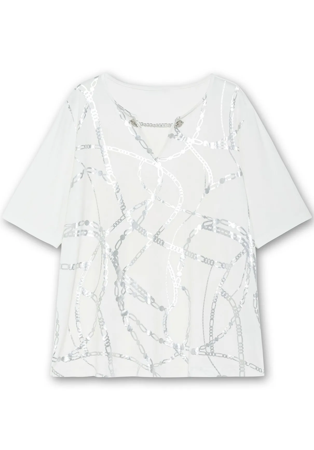 Shirt mit kleinem V-Schlitz am Rundhalsausschnitt. Extravagant wirkt der Verschluss mit Ösen und Metallkette am Ausschnitt. Dazu kommt der silbern schimmernde Folienprint auf der Vorderseite im angesagten Kettendesign, der dem Shirt eine edle Note verleiht. Der verlängerte Kurzarm schmeichelt den Oberarmen, seitliche Saumschlitze lassen das Oberteil locker über die Hüfte fallen.