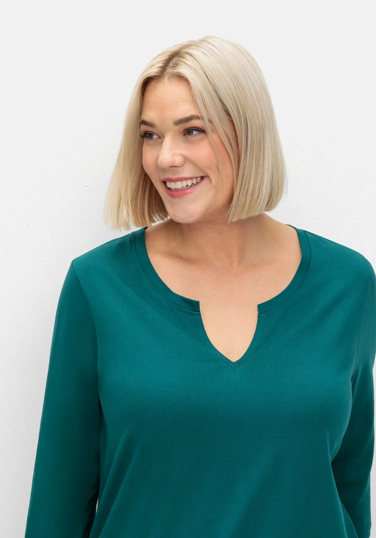 Shirt mit 3/4-Arm. Der schlichte, cleane Look erhält durch den Rundhals mit V-Schlitz eine dezent feminine Note. Hinten schmückt ein kleines Metallloge den Nackenbereich. Ob als Solist oder als Ergänzung – das Shirt ist ein unkomplizierter Allrounder.