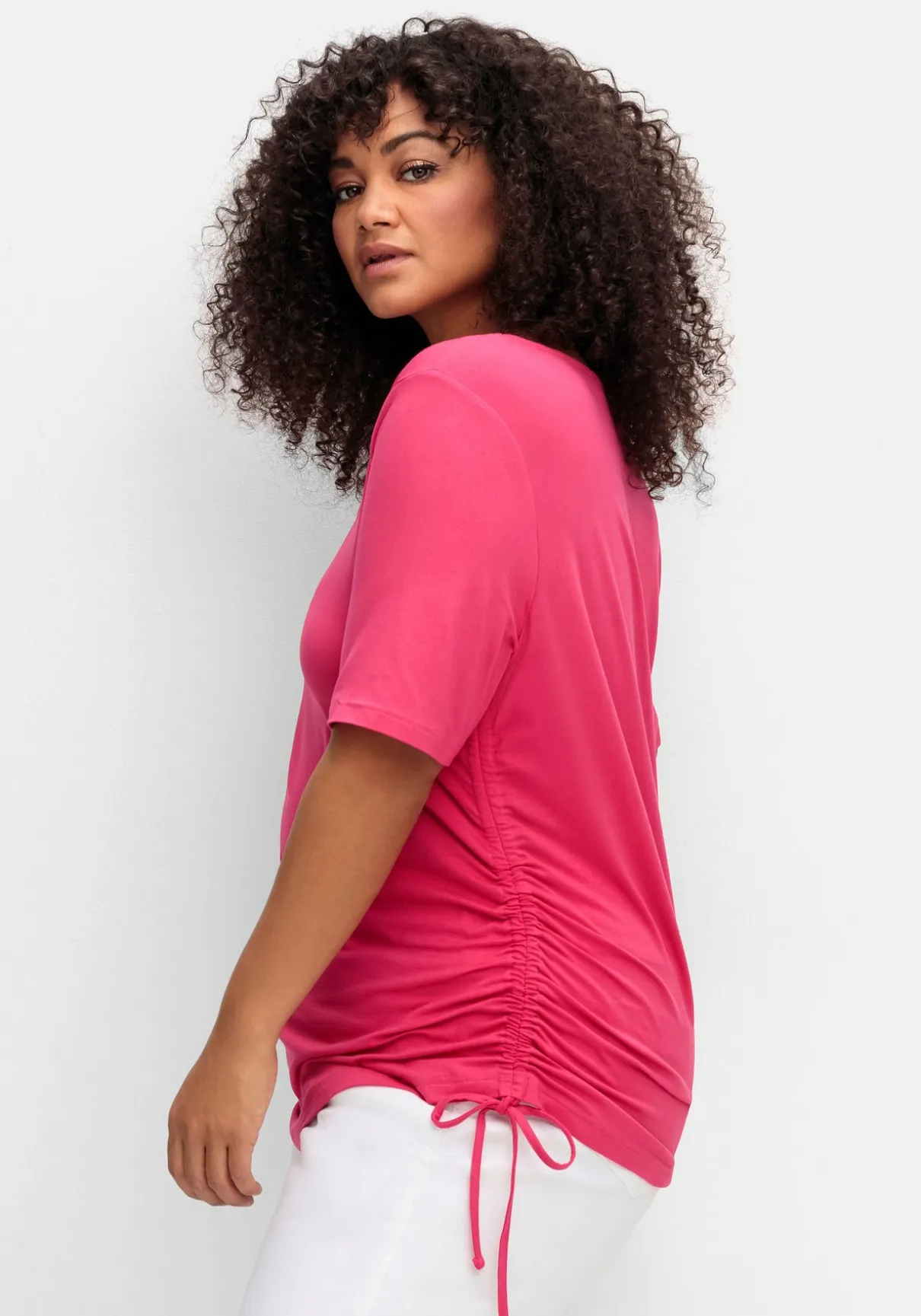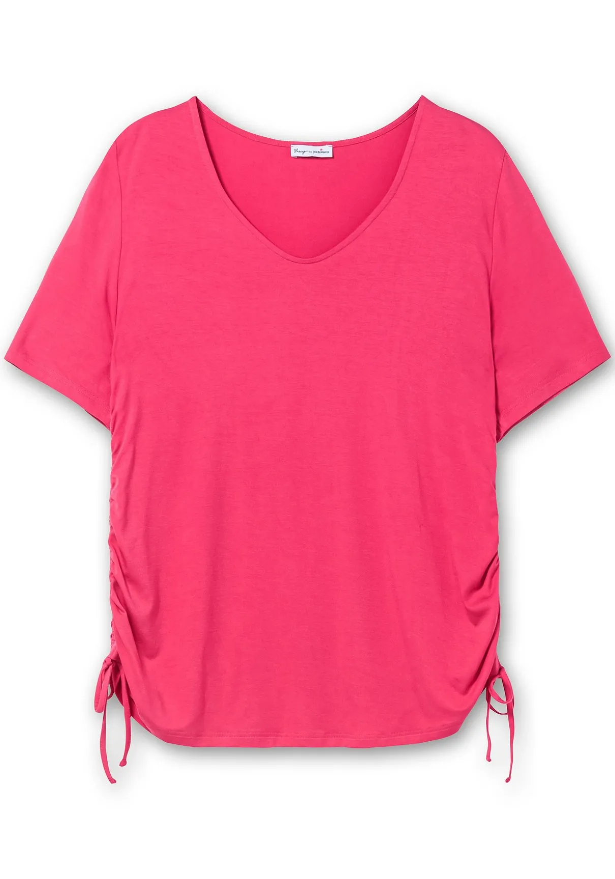 Shirt mit seitlichen Kordelzügen von sheego by Joe Browns – ein Hingucker für jeden Tag. Der leicht gerundete V-Ausschnitt setzt feminine Akzente, der Ärmel ist etwas länger geschnitten. Ein modisches Detail ist der Tunnelzug mit Bindeband, mit dem das Shirt seitlich gerafft werden kann.