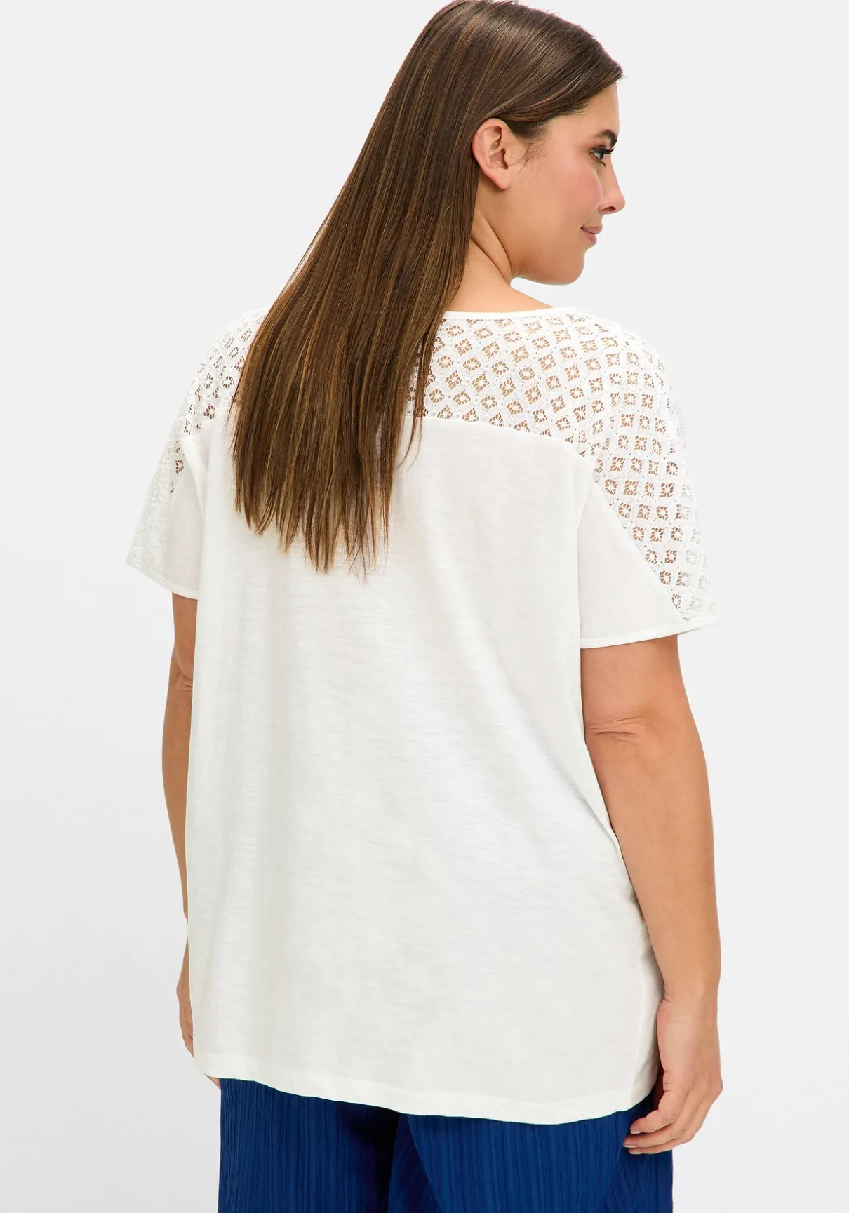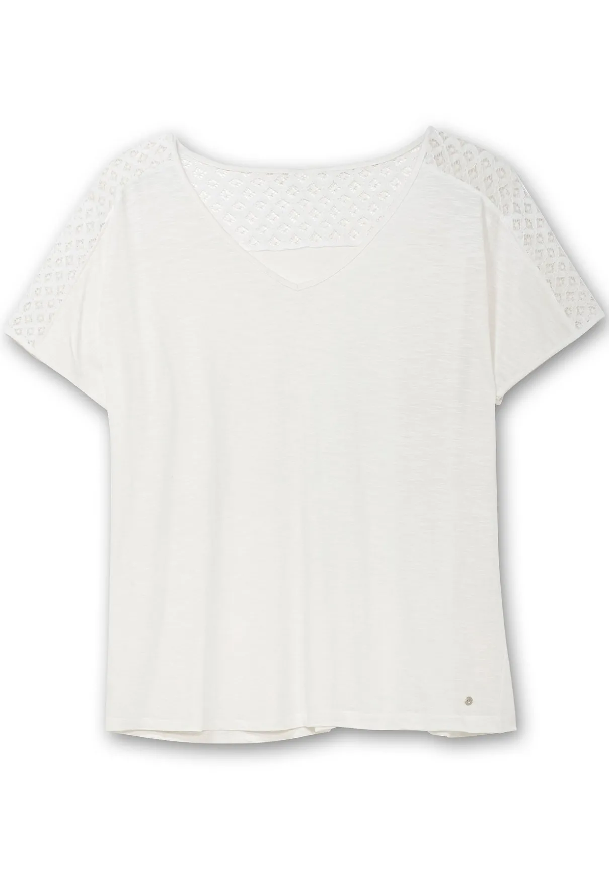 Shirt mit Spitzenbesatz. Der tiefe V-Ausschnitt und die überschnittenen Schultern verleihen dem Shirt eine lässige Optik. Ein besonderes Highlight ist die leicht transparente Spitze im Schulterbereich, die dem Design eine romantische Note verleiht. Der gerade Saumabschluss lässt eine klassische Silhouette entstehen, die unregelmäßige Struktur des Flammgarnjerseys sorgt für optische Effekte.