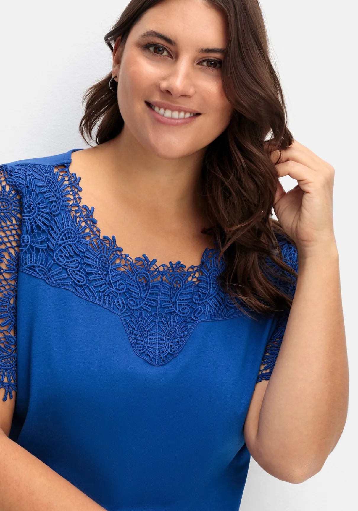 Shirt mit kurzen Ärmeln. Die Ärmel und der Ausschnitt vorn sind mit transparenter Spitze gearbeitet und machen das Shirt so zum femininen Blickfang.