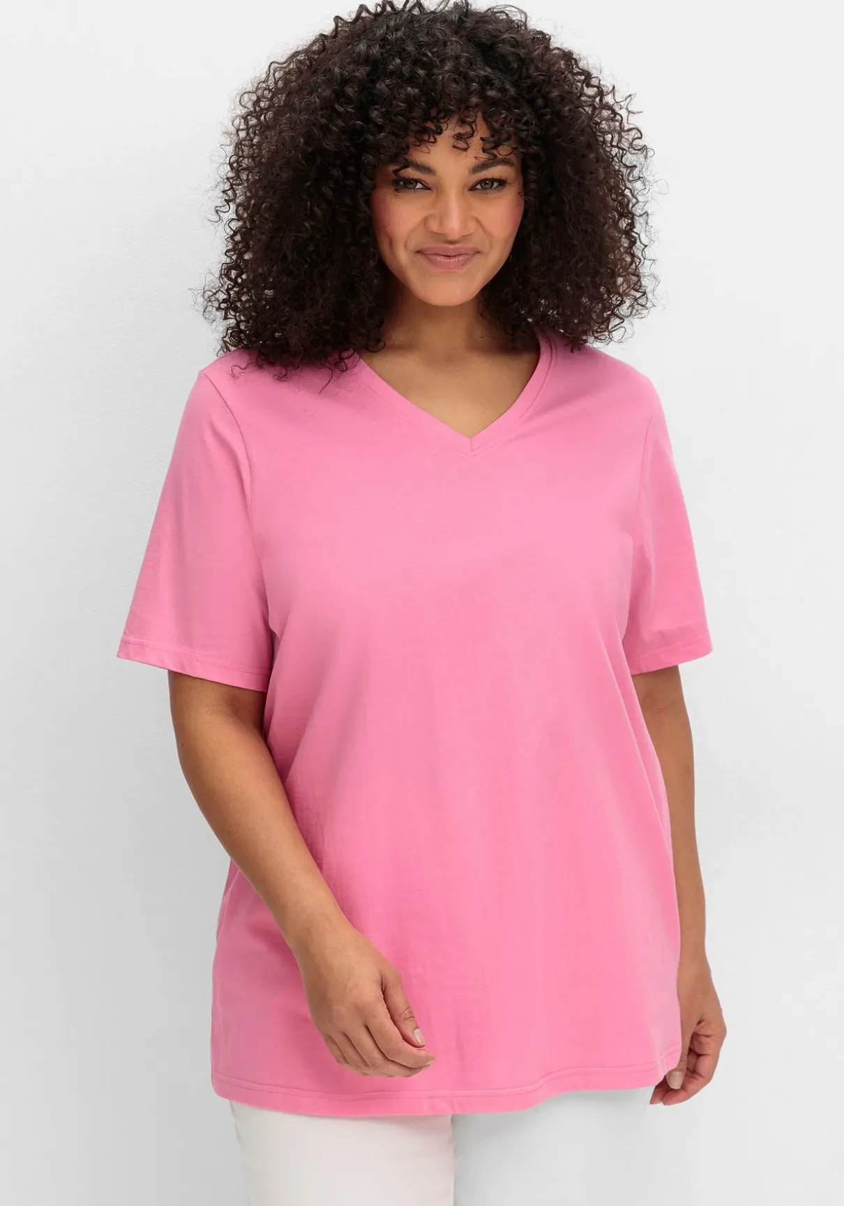 Shirt mit V-Ausschnitt. Unkompliziert und kombistark zeigt sich dieses locker fallende Shirt aus leichtem Baumwolljersey. Es ist mit V-Ausschnitt und kurzen Ärmeln gearbeitet. Sein leicht taillierter Schnitt endet mit einem geraden Saum – so lässt sich das Shirt genauso gut im wie über dem Bund tragen.