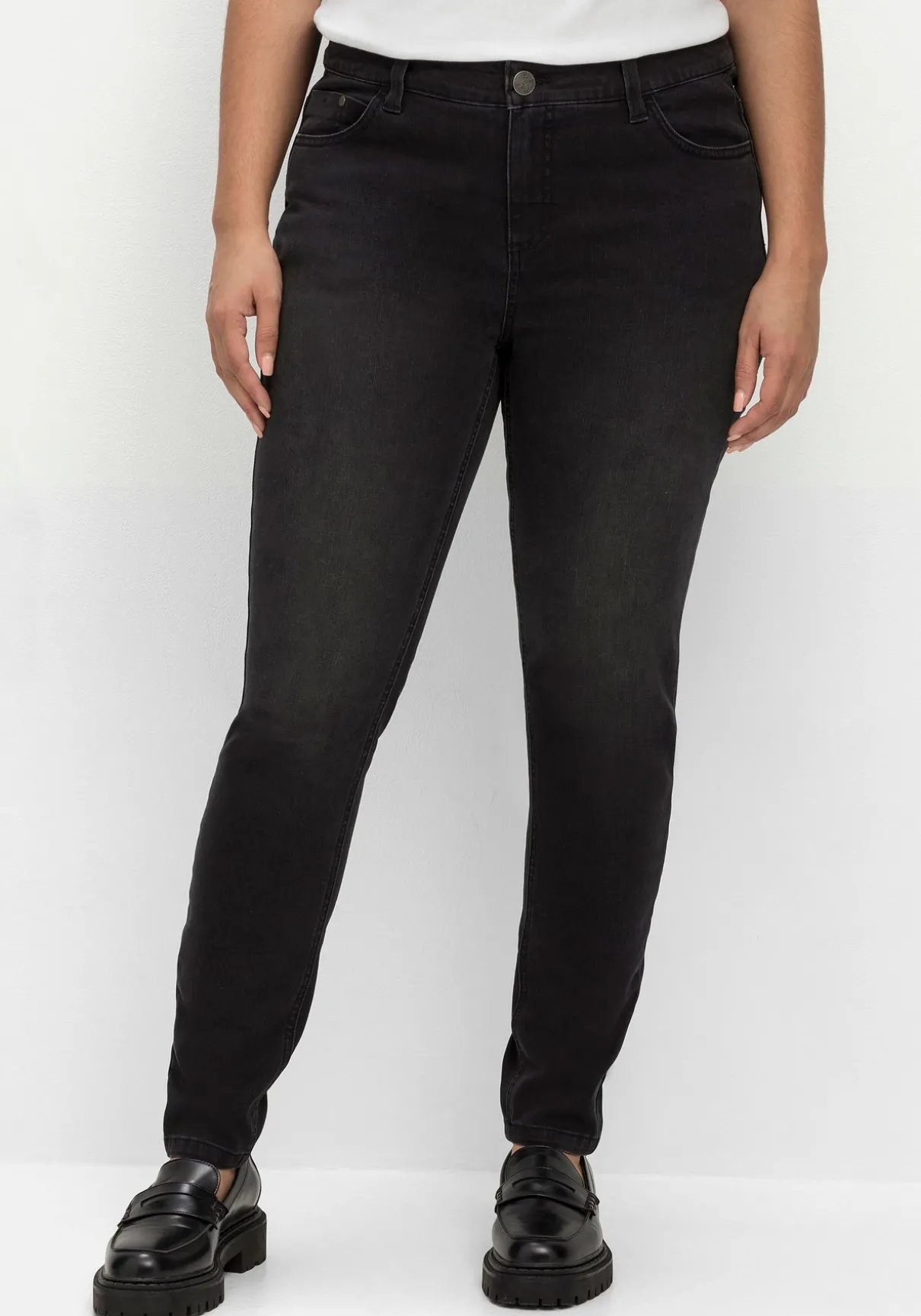 Skinny Jeans in Curvy-Schnitt SUSANNE. Die Hose ist genau auf die Figur mit mehr Bauch sowie sehr schmalen Beinen und Oberschenkeln zugeschnitten. Ansonsten zeigt sie sich unkompliziert mit Formbund, Gürtelschlaufen und der klassischen 5-Pocket-Form.