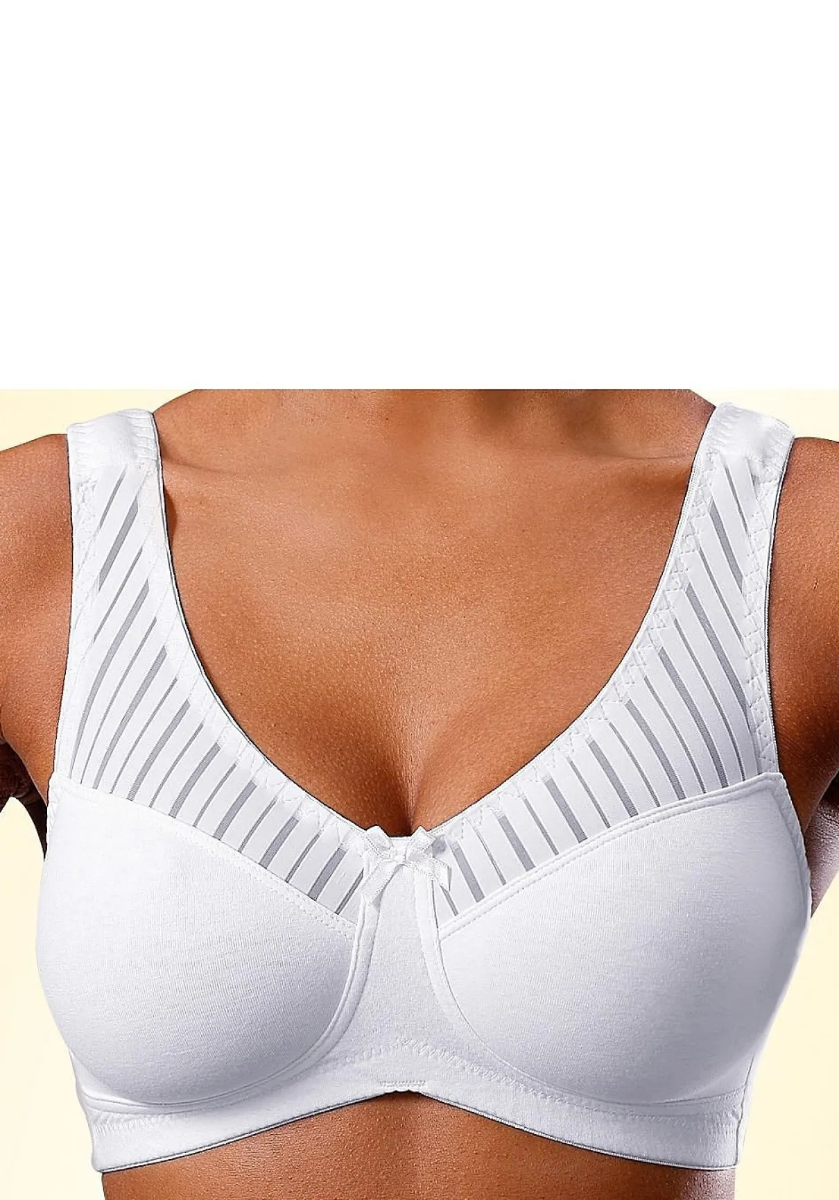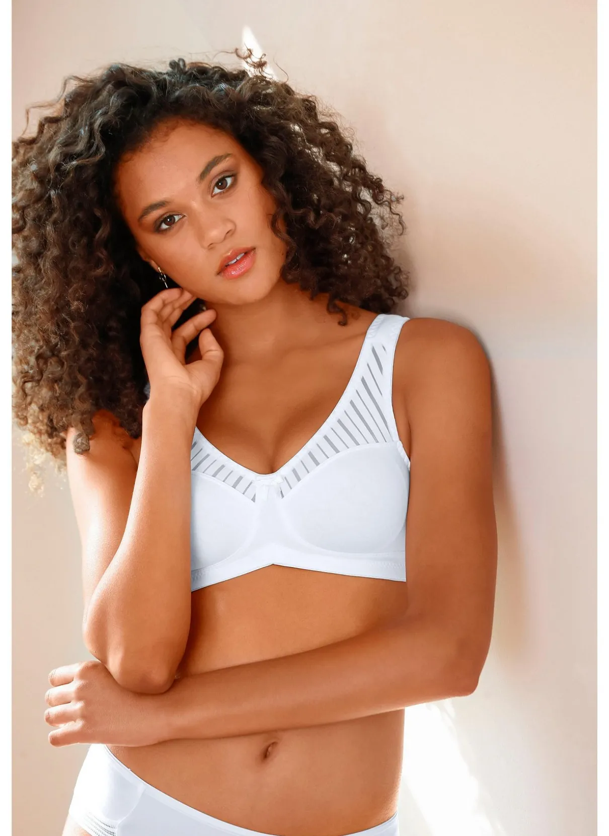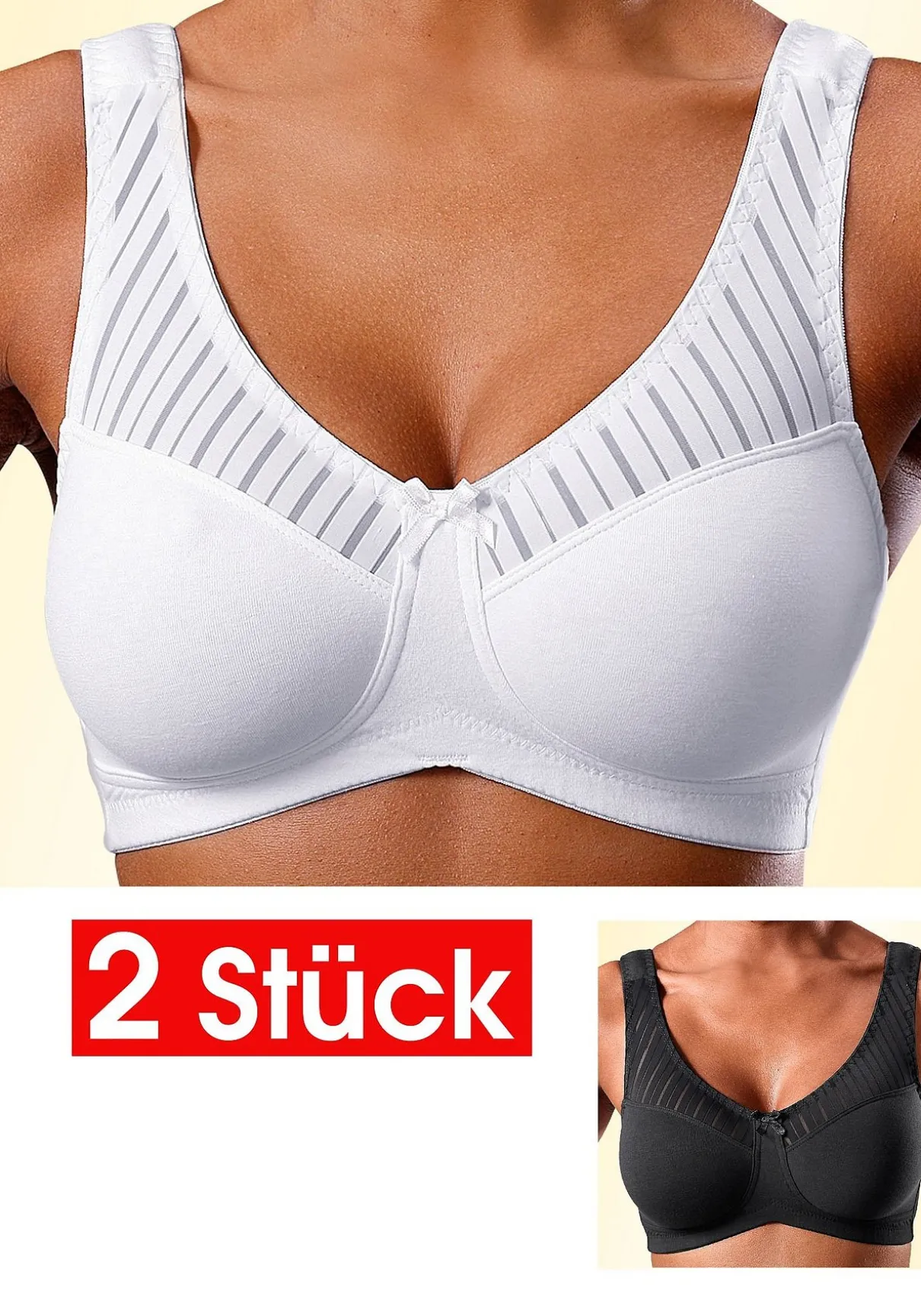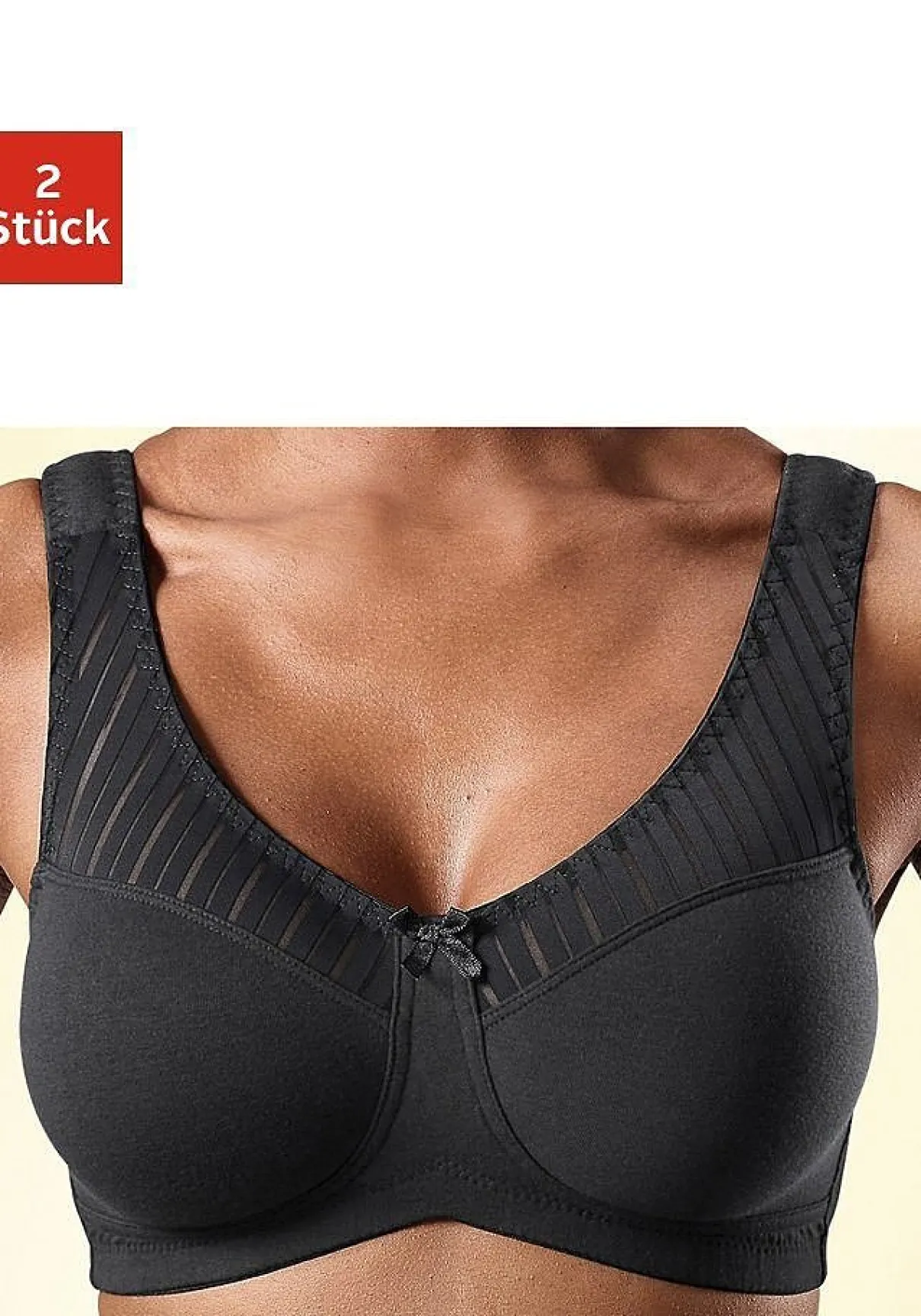 Bequemer Basic BH zum Wohlfühlen. Im Mittelpunkt steht ein angenehmes Tragegefühl. Durch die Verarbeitung ohne Bügel gibt es kein Zwicken oder Drücken. Für eine tolle Passform ist dennoch gesorgt: die nahtlos vorgeformten, leicht wattierten Cups in abdeckender Schnittform umschließen die Büste sicher. Das Unterbrustband und die breiten Seitenteile unterstützen zusätzlich einen perfekten Sitz. Die breiten, entlastenden Träger sind in der Länge regulierbar und weich gefüttert, so dass sie nicht einschneiden. Die Optik ist angenehm schlicht und zeitlos gehalten mit hübschem Streifenmaterial im Obercup und an den Trägern. Im günstigen Doppelpack erhältlich. Rückenverschluss verstellbar. Der BH ist aus 85% Baumwolle, 10% Polyamid, 5% Elasthan. BHs sind nicht trocknergeeignet, da die Versteller und Ringe durch die Hitze beschädigt werden und brechen. Fühlen Sie sich wohl mit Susa!