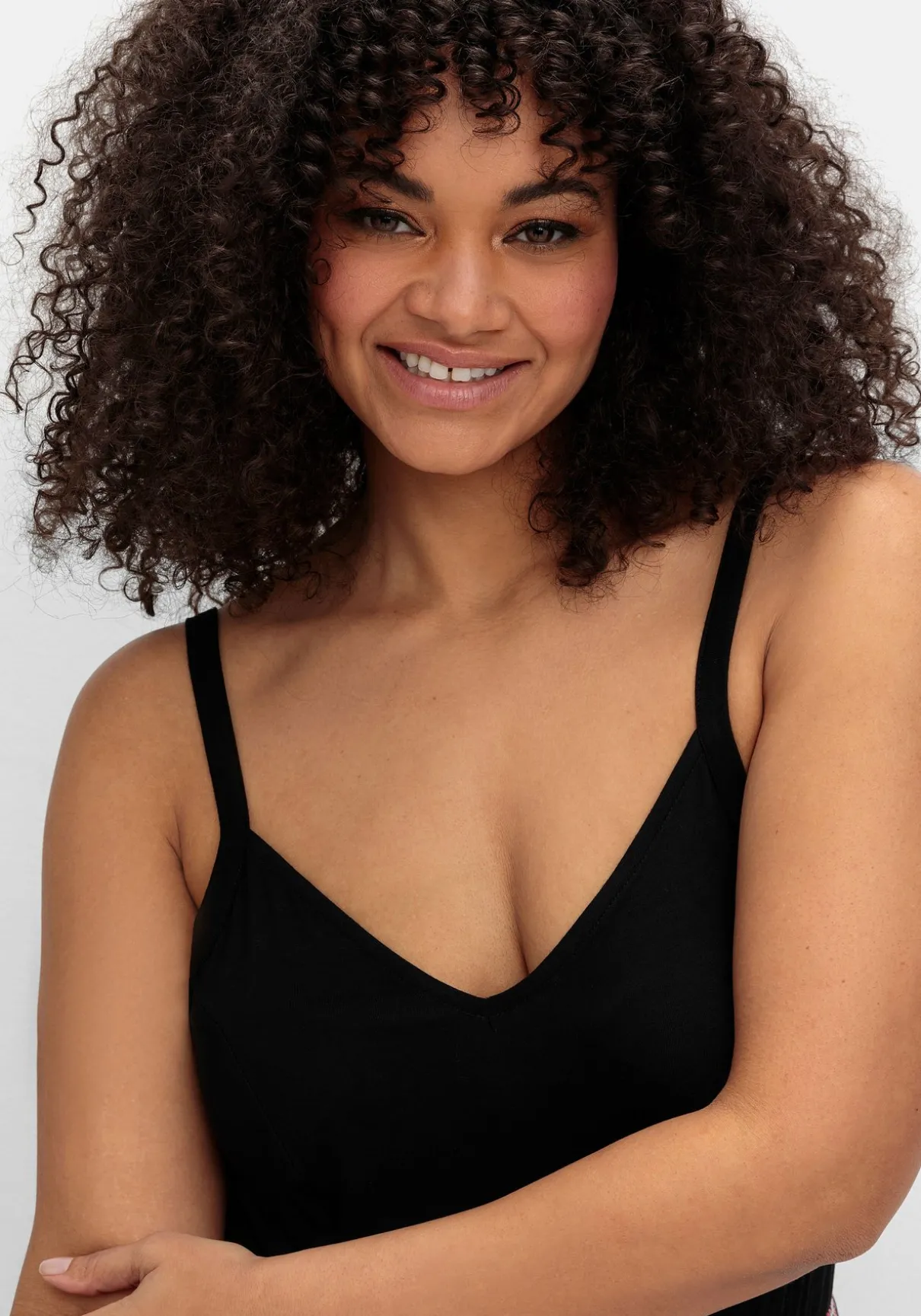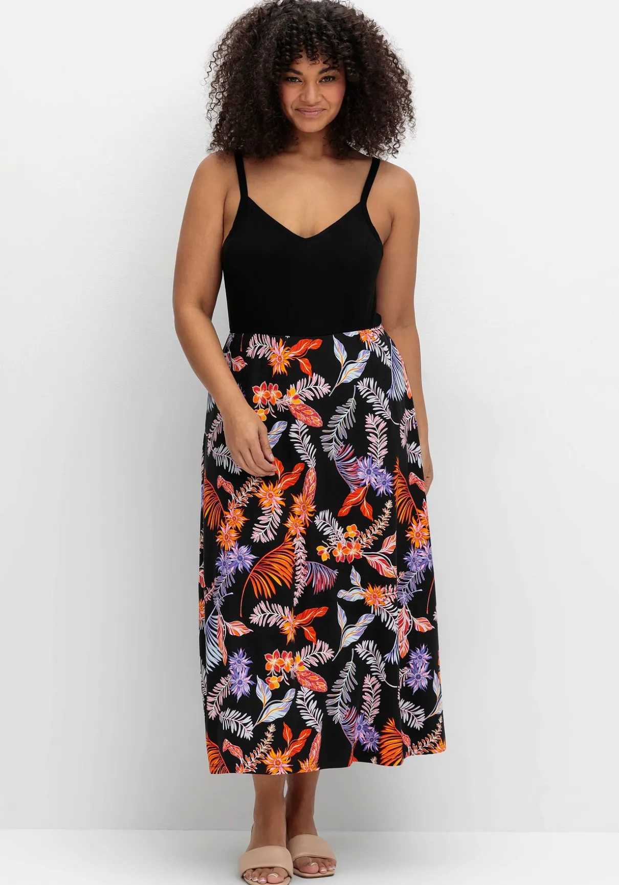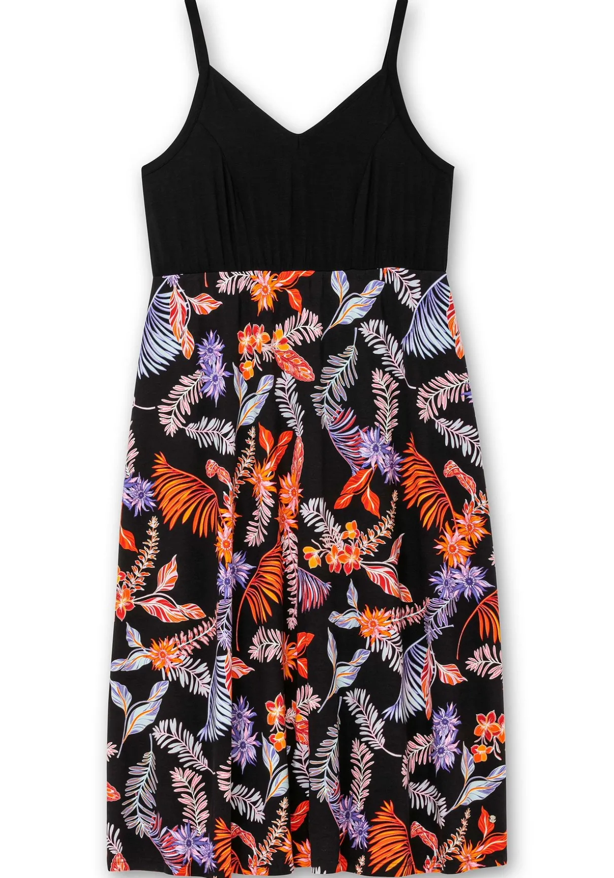 Kleid mit schmalen Trägern. Zum sommerlich-floralen Druck setzt das unifarbene Oberteil einen modischen Kontrast. Im Rücken sorgt ein eingearbeiteter Smokeinsatz für einen bequemen Sitz. Darunter schließt sich der wadenlanger Rock an, der luftig über die Beine fällt.