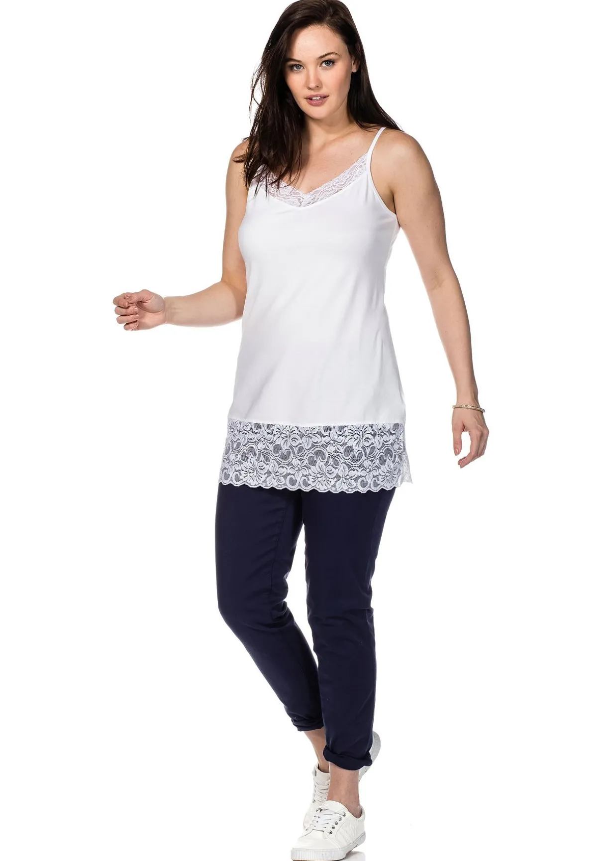 Top mit Spaghettiträgern. Eyecatcher ist der zarte Spitzenbesatz an Ausschnitt und Saum. Die breite Spitzenbordüre am Saum macht das Top zum: femininen Partner für den aktuellen Lagen-Look.