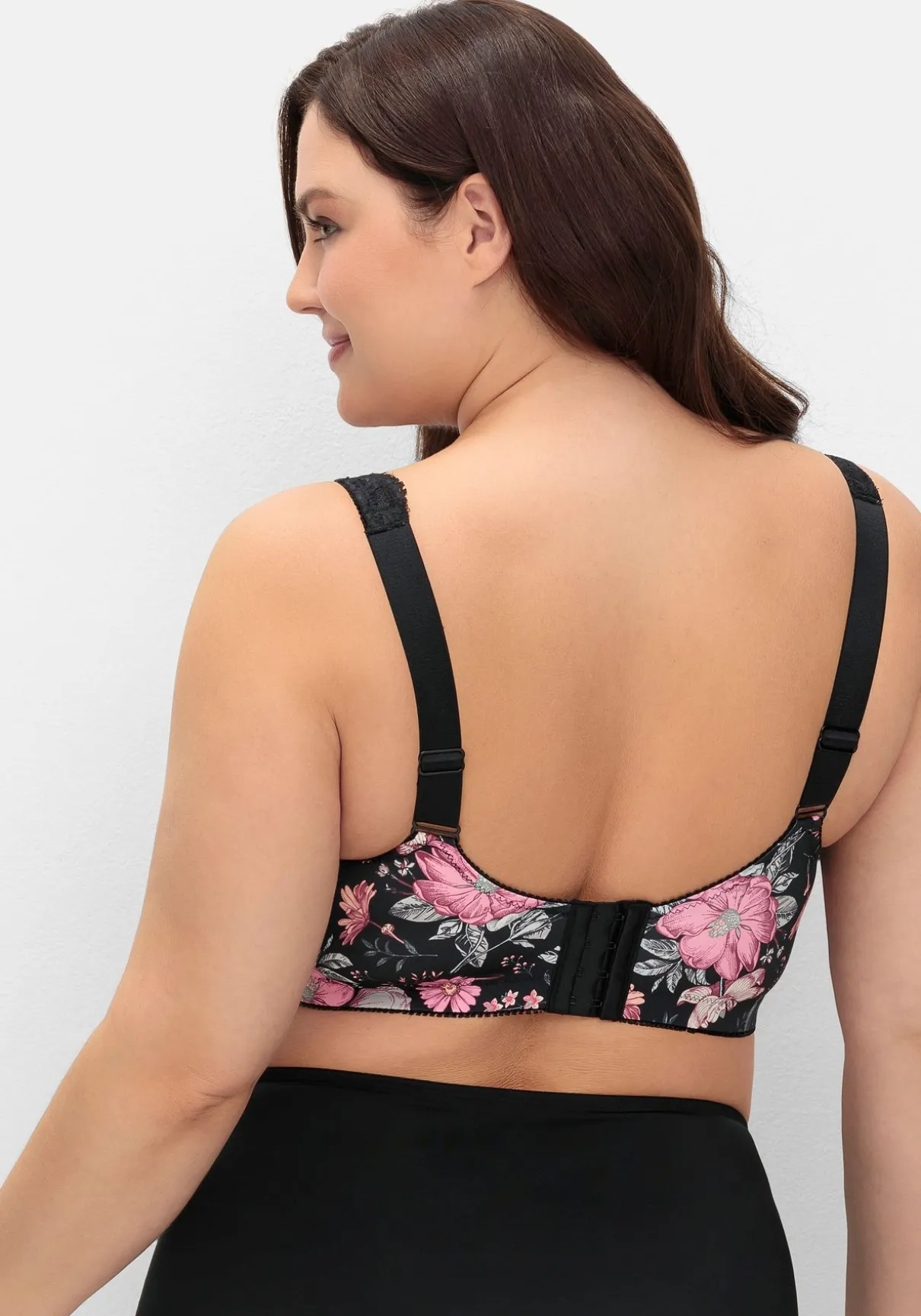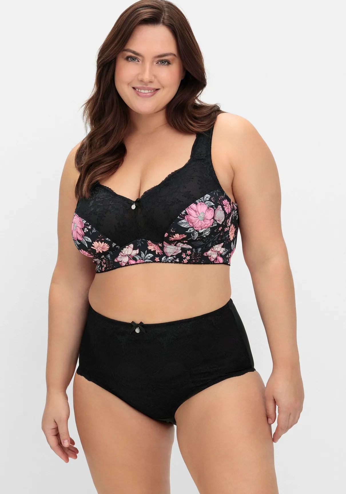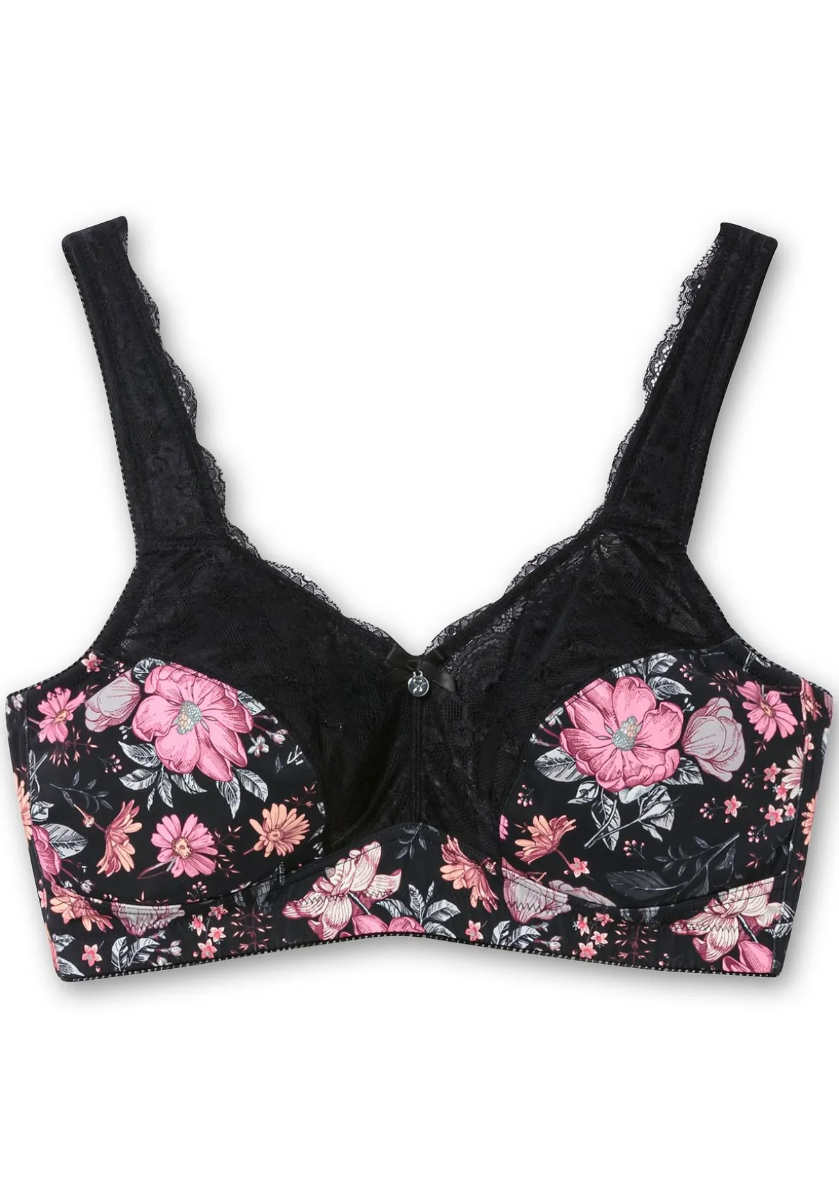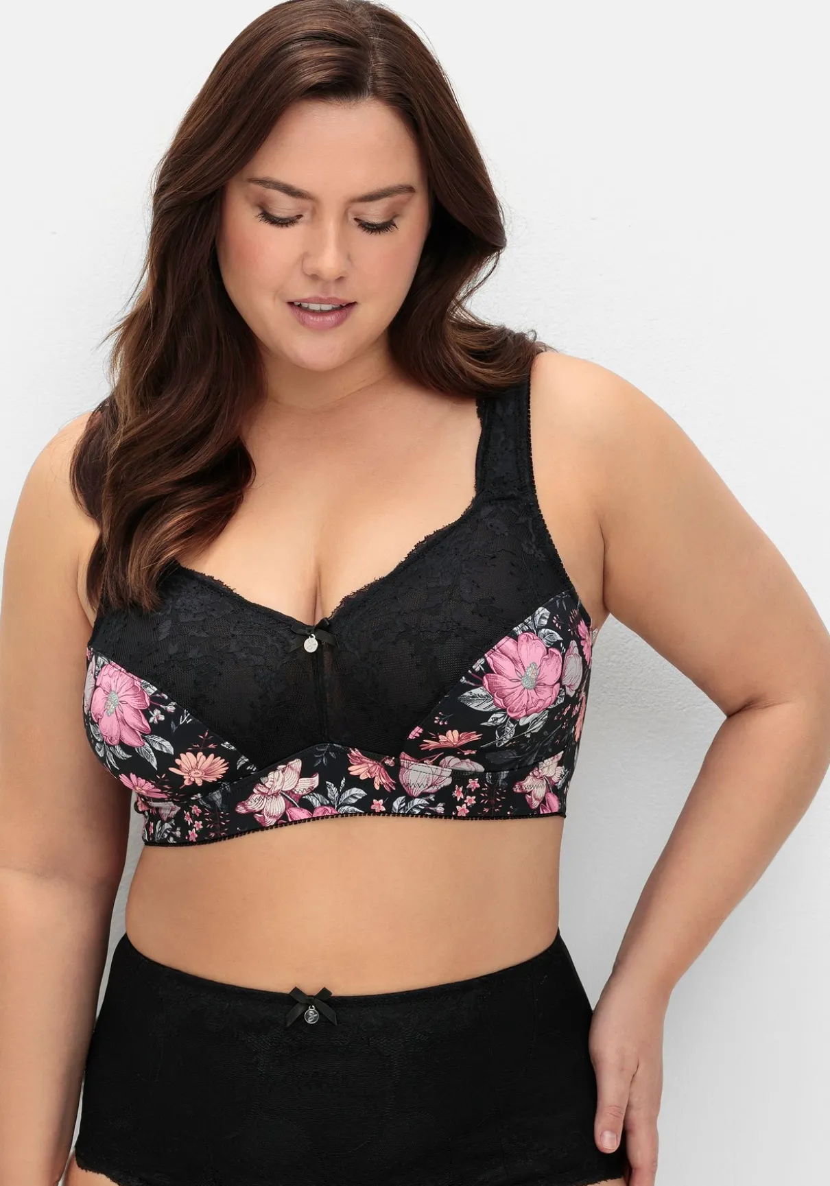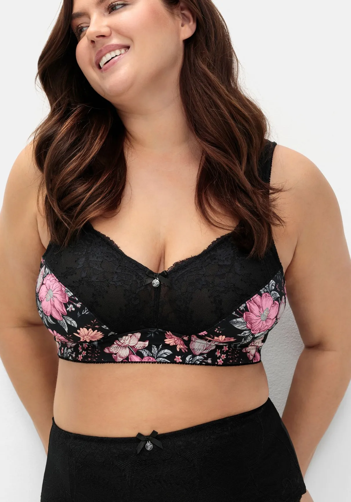 Bügelloser BH mit Spitzenbesatz. Der BH besticht durch den femininen Blumenprint, die zarte Blütenspitze und ein kleines Schleifendetail am Ausschnitt. Die bequeme Form ohne Bügel wird durch ein stützendes Mesh-Innenfutter ergänzt.