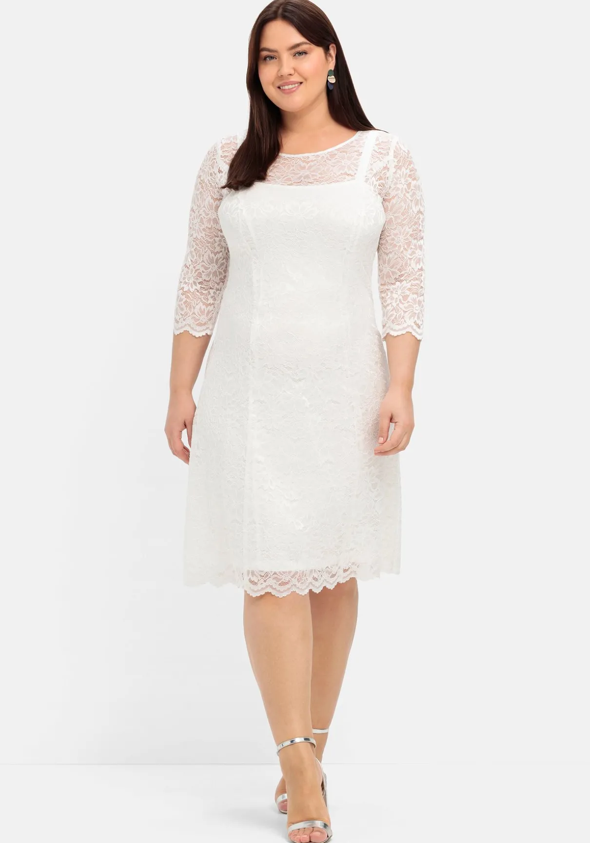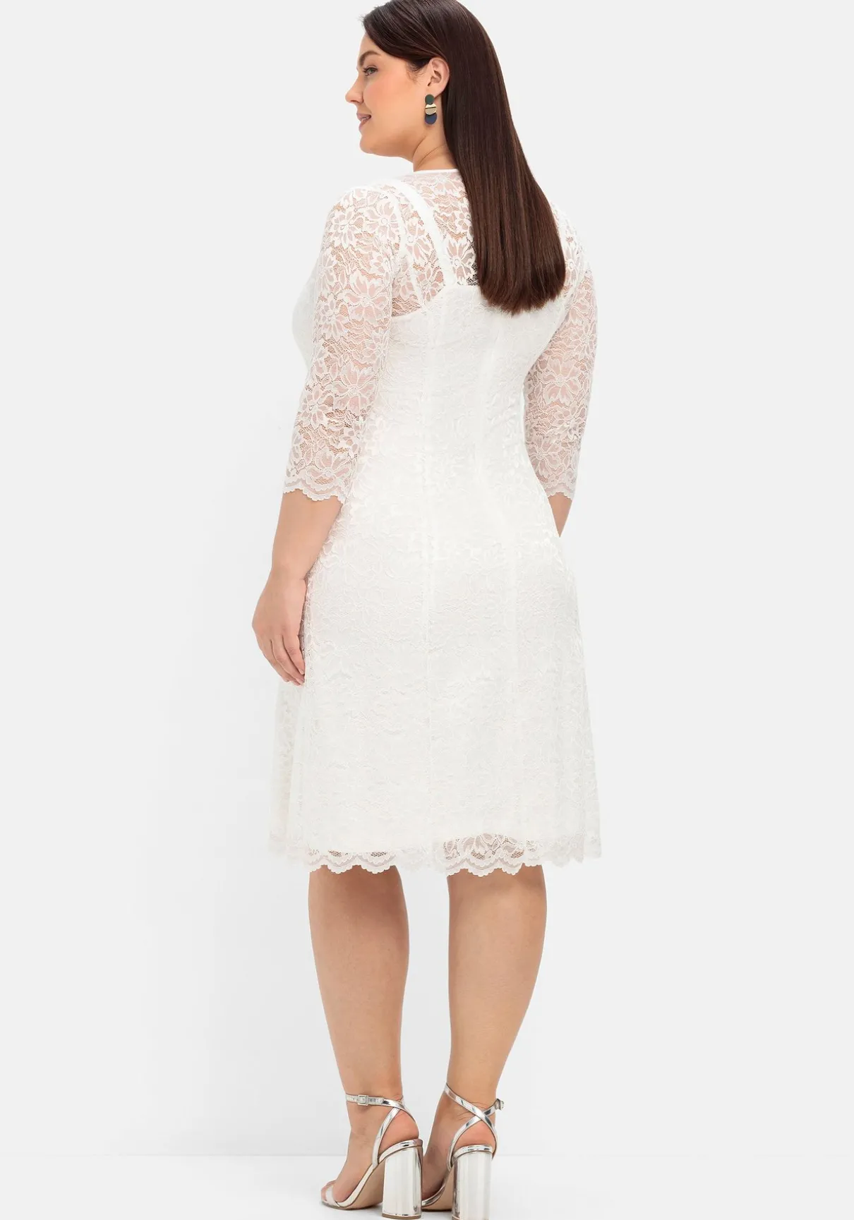 Spitzenkleid mit Wellenkanten an den Abschlüssen. Der leichte Glanz und die florale, elastische Spitze lassen das Abendkleid elegant und hochwertig wirken. Die feine Transparenz im Schulterbereich und an den 3/4-langen Ärmeln sorgt für noch mehr feminine Raffinesse. Im Rücken befindet sich ein nahtfeiner Reißverschluss.
