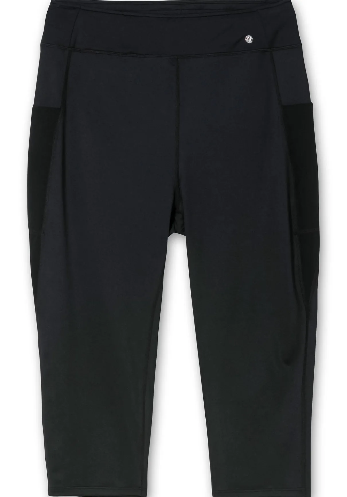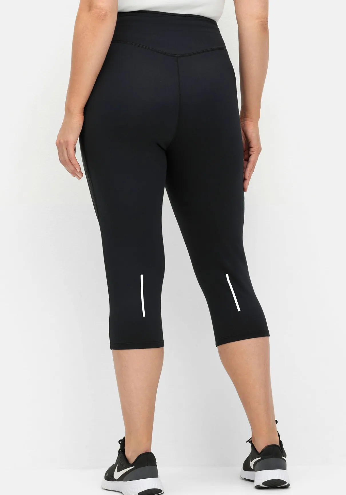 Funktions-Leggings in Caprilänge. Diese Leggings überzeugen durch ihren hoch geschnittenen, elastischen Bund, der mit einem innenliegenden Bindeband reguliert werden kann. Eine kleine Sicherheitstasche innen am Bund bietet Platz für den Spindschlüssel oder ein paar Münzen. Für bessere Sichtbarkeit in der Dunkelheit sorgen die Reflektorstreifen hinten am Beinabschluss, seitliche Mesh-Taschen bieten praktischen Stauraum für Handy und Co.