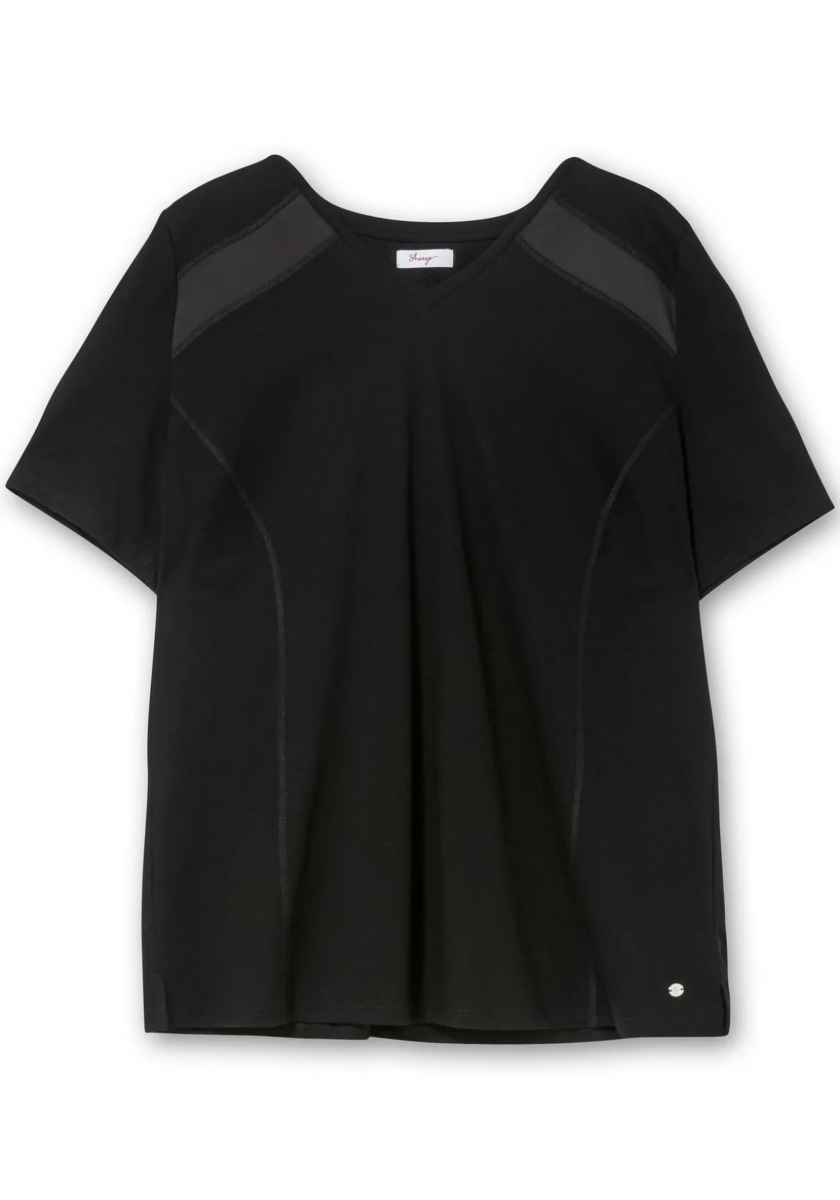 Das Shirt ist figurumspielend geschnitten. Es besitzt einen streckenden V-Ausschnitt und einen geraden Saum. Durch die Seitenschlitze am Saum fällt es angenehm locker, die verlängerten Ärmel schmeicheln den Oberarmen.