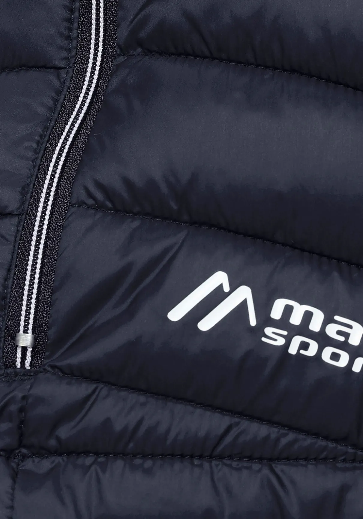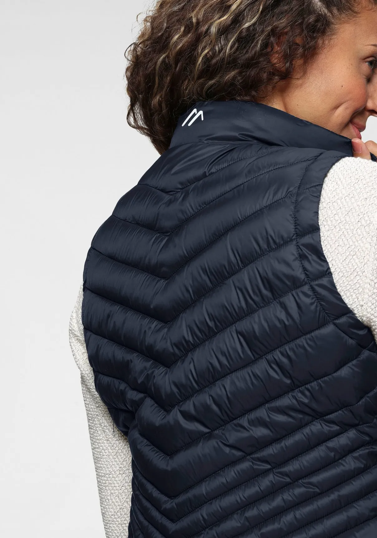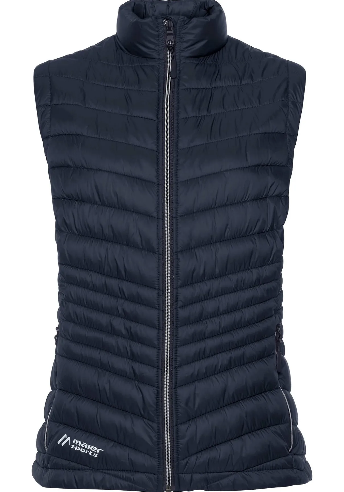 Steppweste von Maier Sports mit hoch abschließendem Kragen. Labelprint vorn. Reißverschlüsse zweifarbig. Zwei Reißverschlusstaschen. Tunnelzug im Saum. Kinnschutz. Taillierte Passform. Wattierte, wasserabweisende, winddichte und atmungsaktive Qualität.
