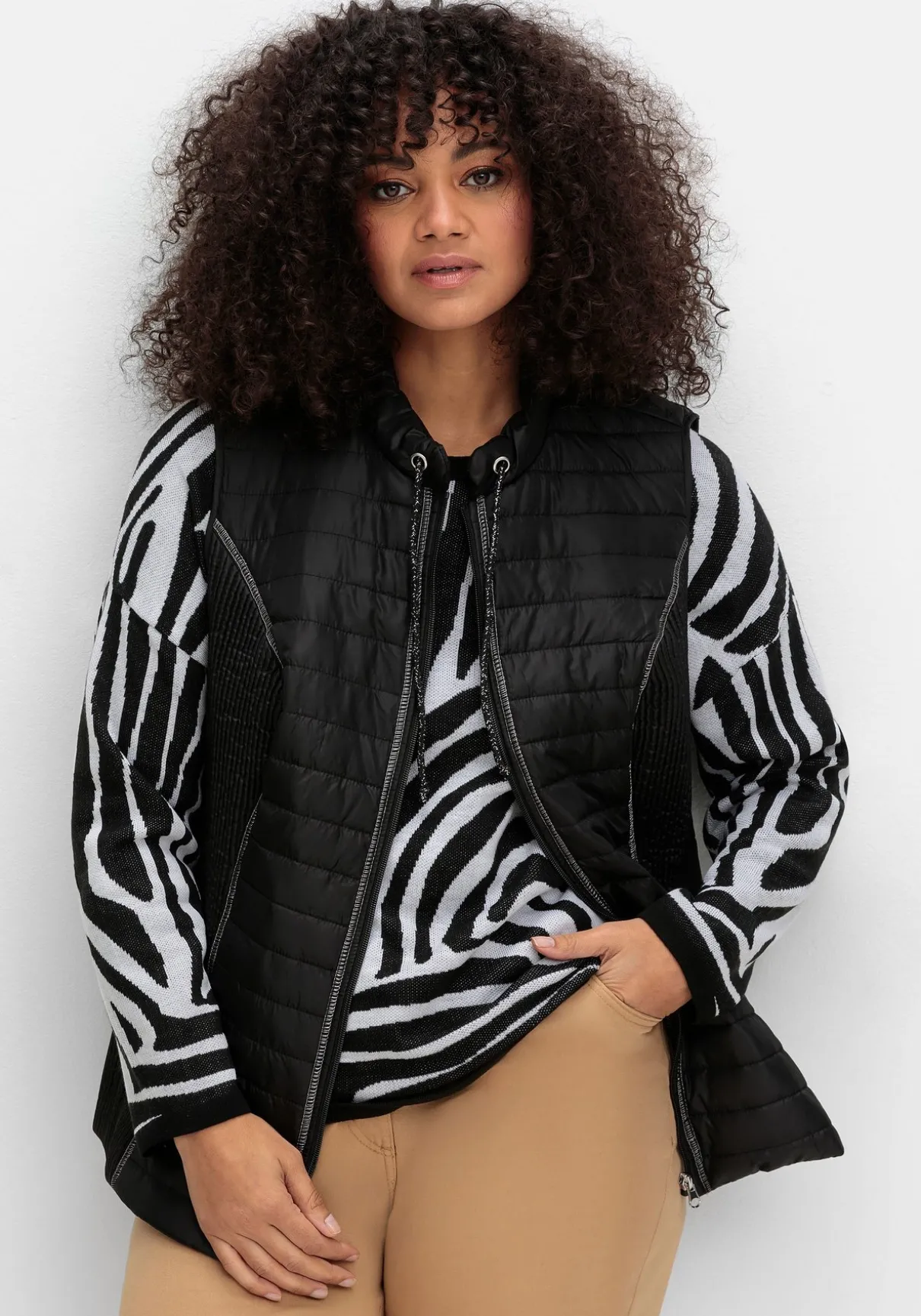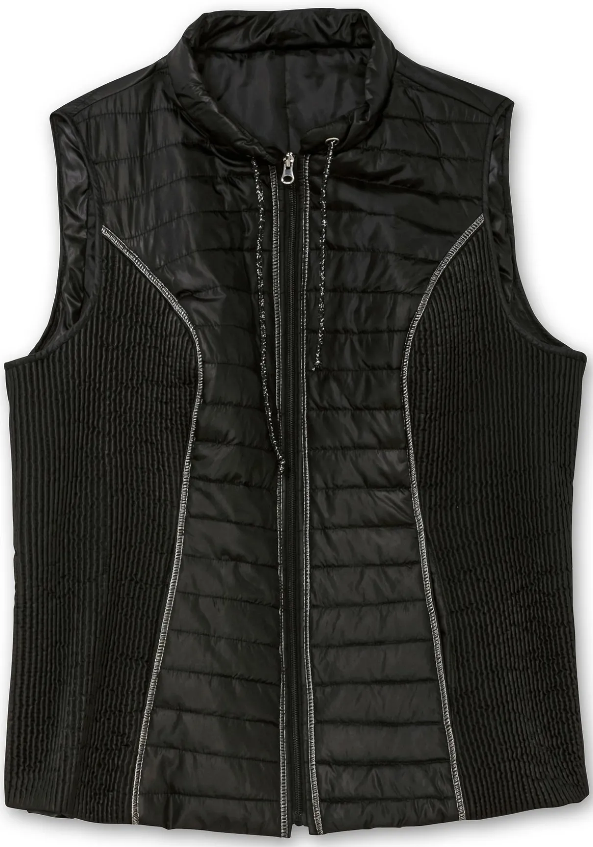 Outdoorweste mit modischer Steppung. Dabei setzen die seitlichen Smokeinsätze einen spannenden Kontrast zur leicht glänzenden Steppung in der Mitte, auch die silberfarbenen Details an Bindeband, Reißverschluss und Nähten unterstreichen den Effekt. Der Stehkragen mit Kordelzug verleiht der Weste eine sportive Note, während die zwei Nahttaschen praktische Funktionalität bieten. Formgebende Wiener Nähte sowie die Ziernähte mit Glanzgarn sorgen für eine elegante Kontur, auch die gesmokten Einsätze an den Seiten wirken optisch streckend.