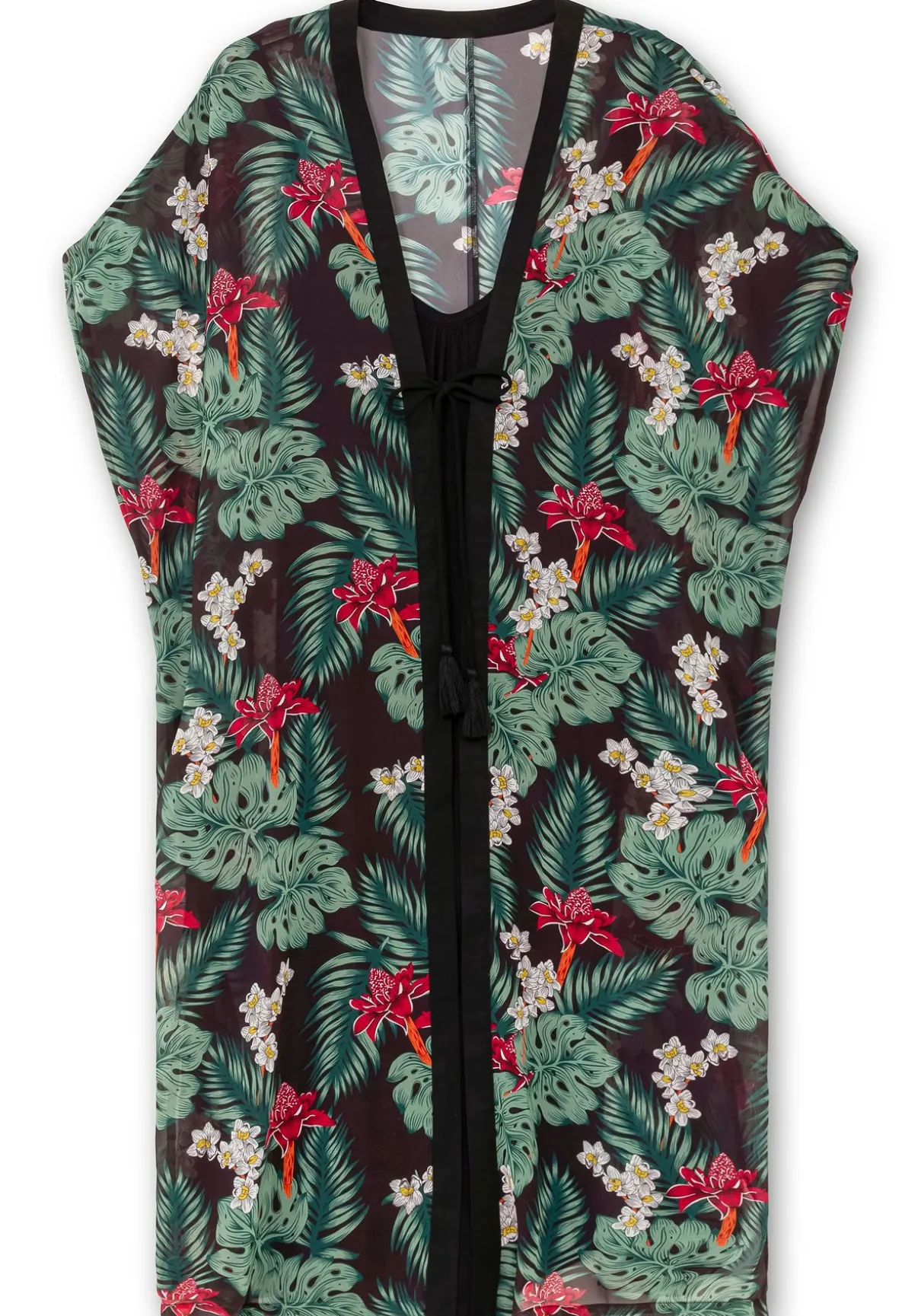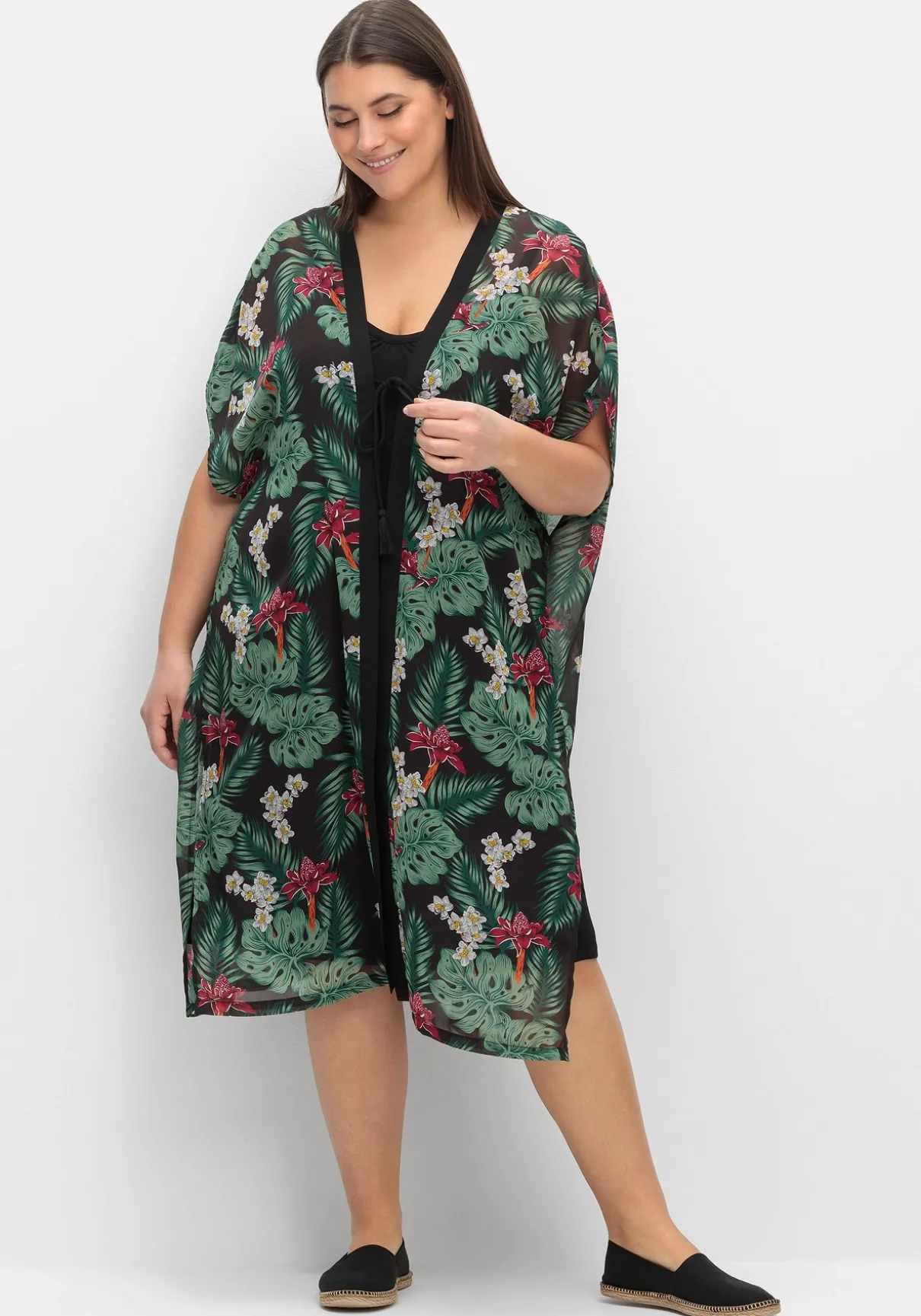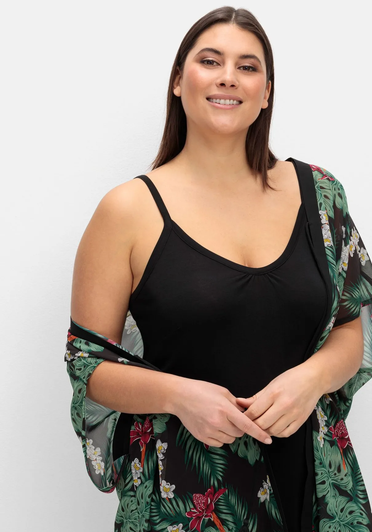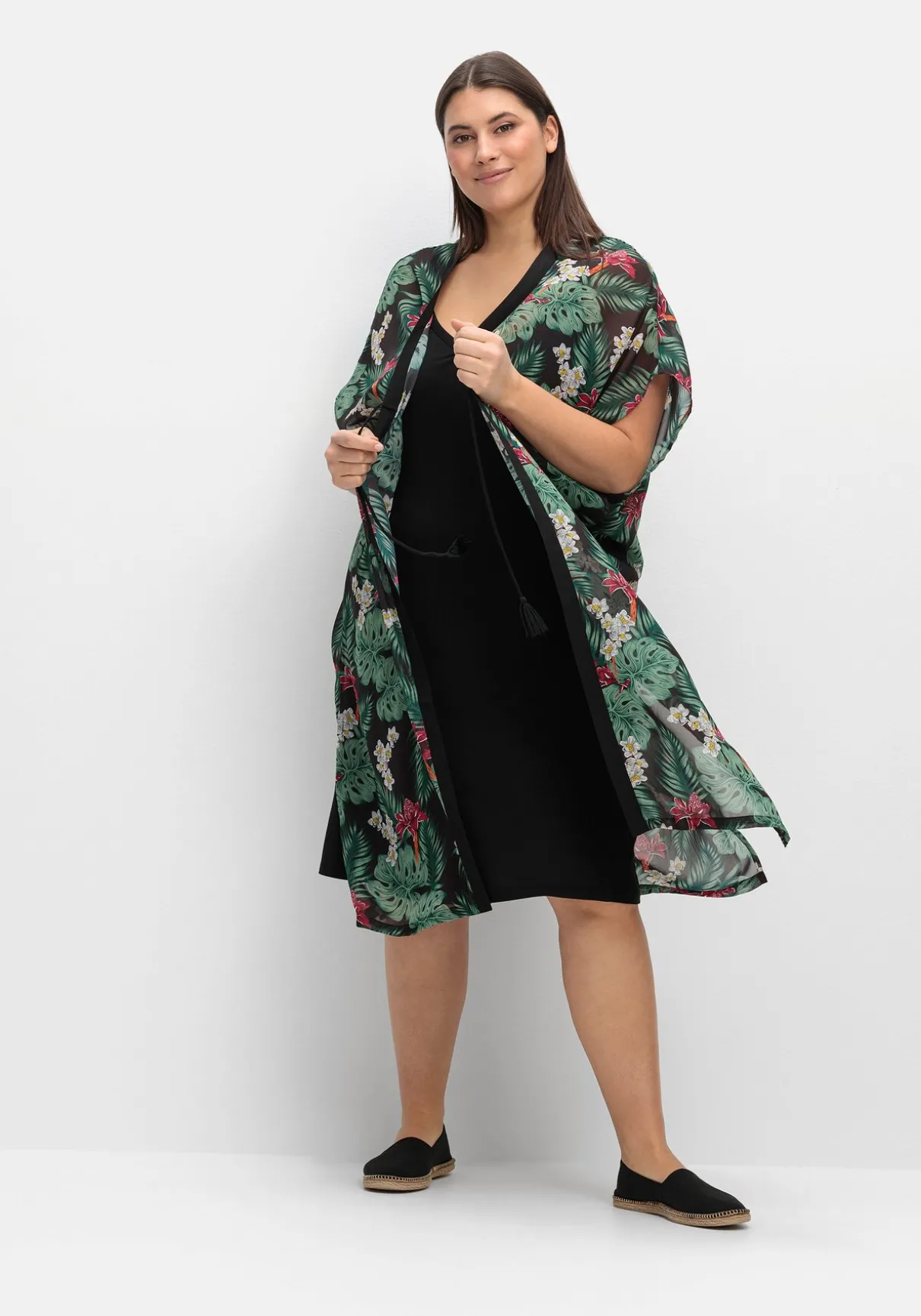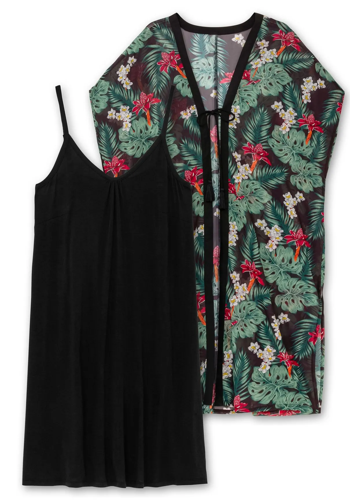 Strandset aus Jerseykleid und Chiffon-Kaftan. Das Kleid ist mit schmalen, verstellbaren Trägern und einem gerafften Rundhalsausschnitt versehen. Der Chiffon-Kaftan ist in offener Form gestaltet und mit hohen seitlichen Schlitzen und überschnittenen Schultern gearbeitet.