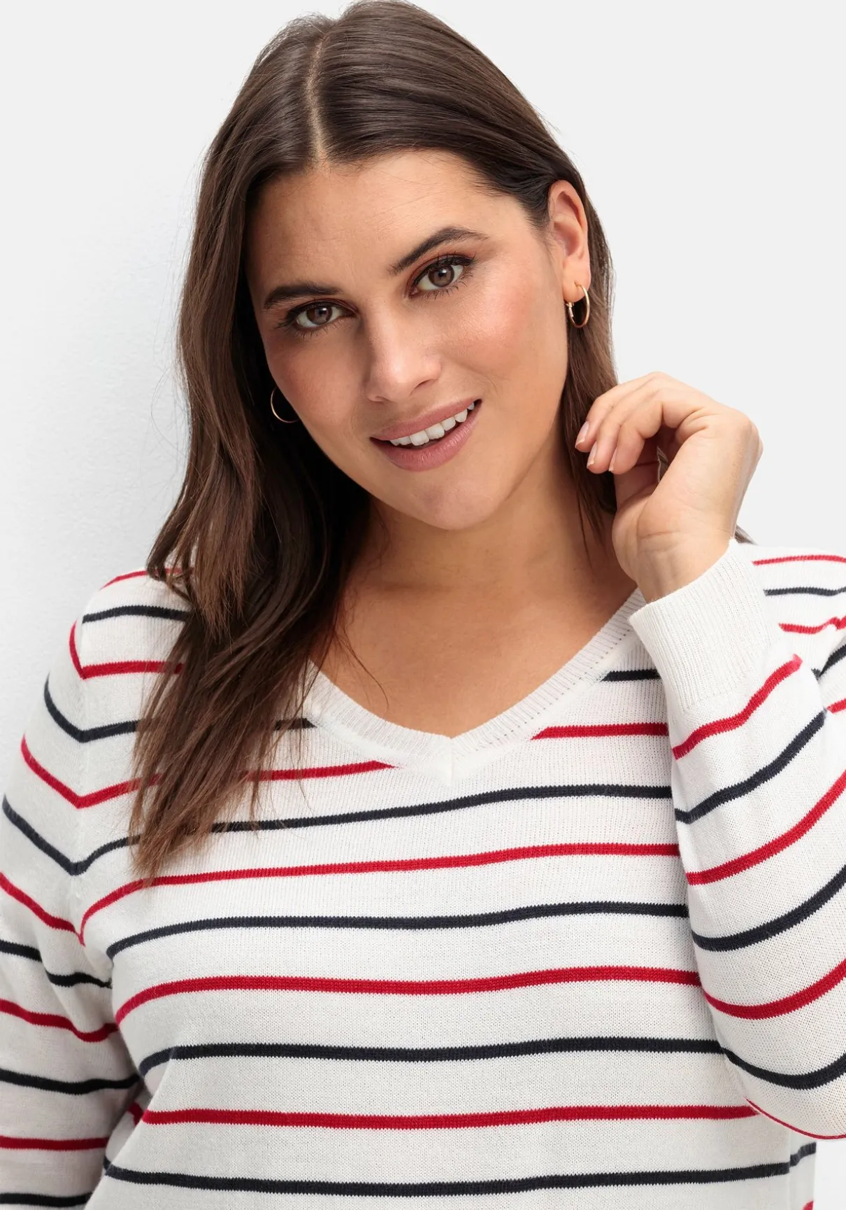Pullover mit geripptem V-Ausschnitt. Zweifarbige Ringel sorgen für maritimen Charme. Lässig abgerundet wird der Pulli durch die gerippten Kontrast-Abschlüsse.