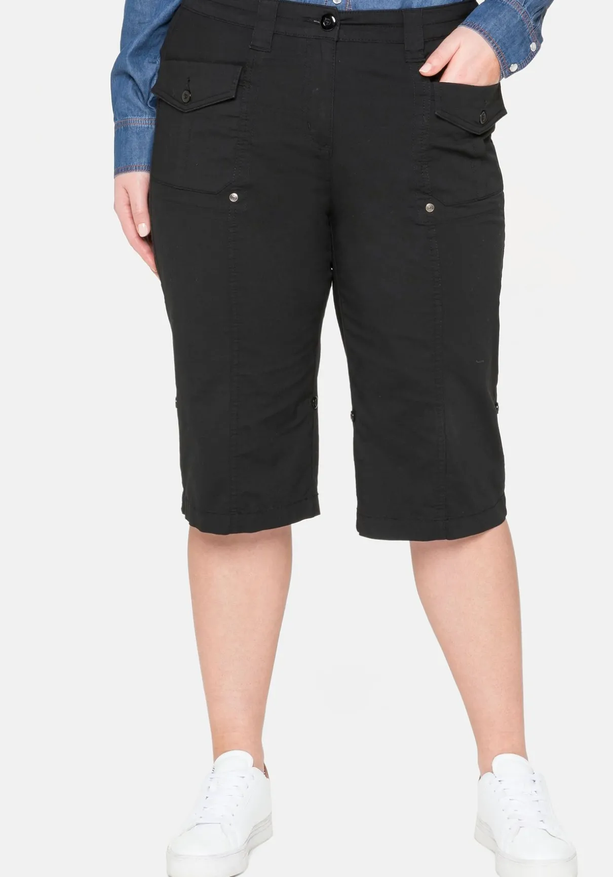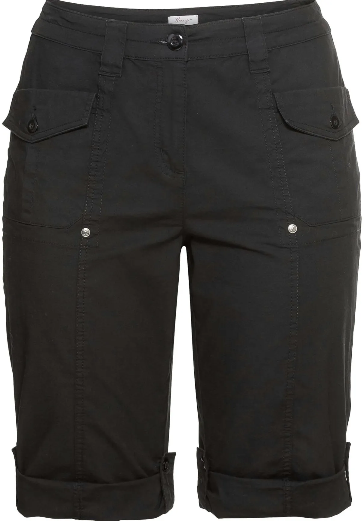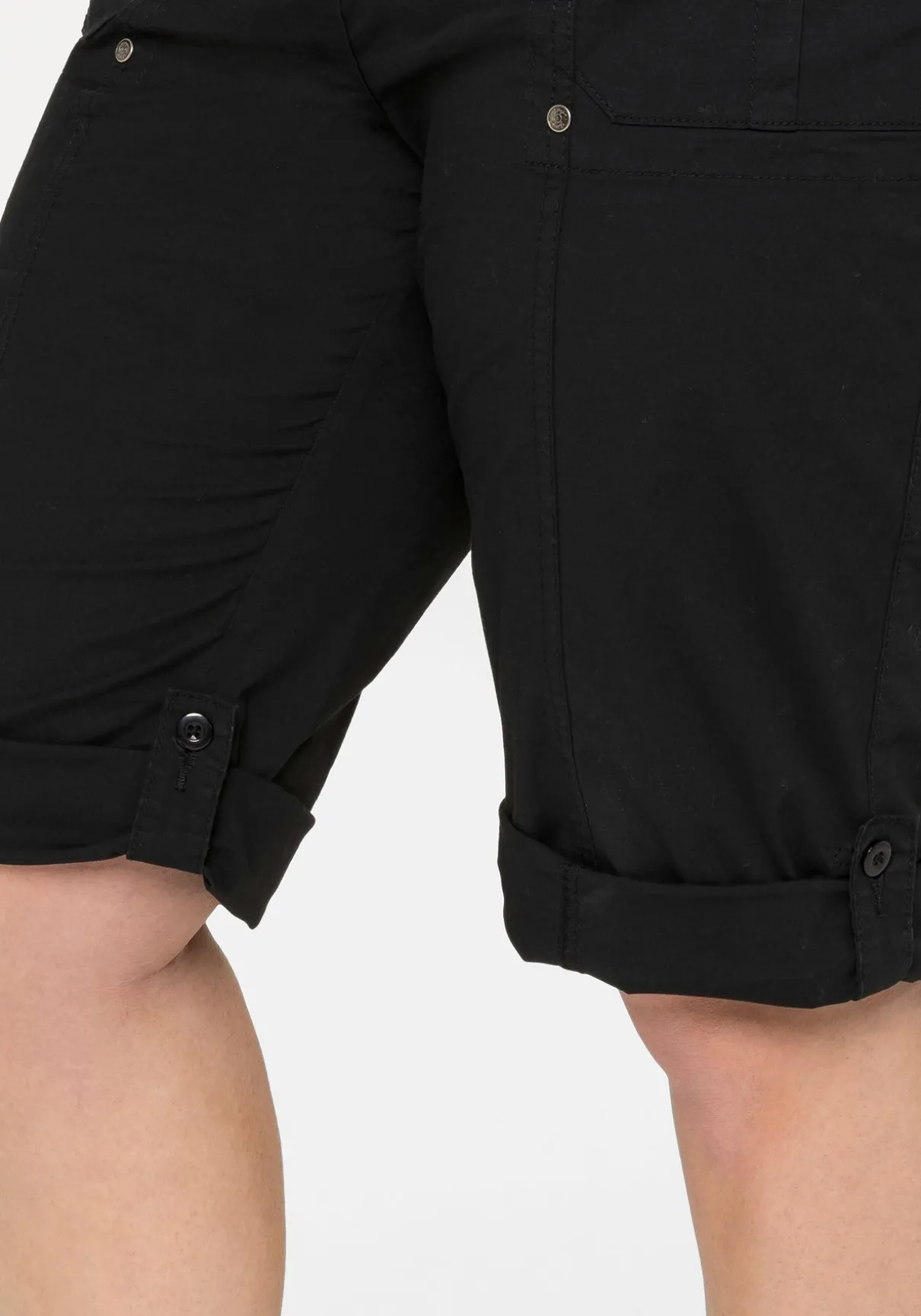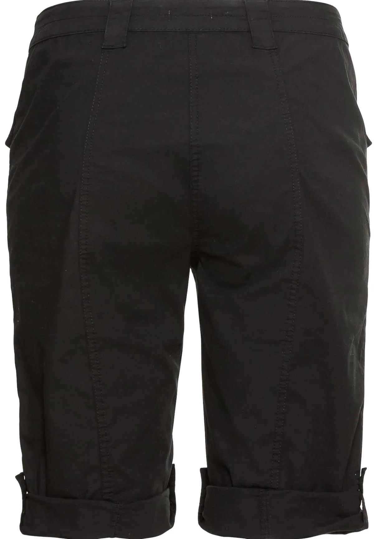 Bermudas in Popelin-Qualität. Aufgesetzte Taschen mit Patten und Knöpfen geben den kurzen Hosen einen sportiven, legeren Freizeit-Look. Dazu lässt sich die Beinlänge variabel mit Riegeln und Knöpfen verstellen. Der Formbund wird durch Gürtelschlaufen sowie einem 1-Knopf-Verschluss ergänzt.